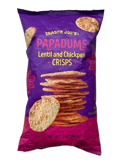 Satisfy your snack cravings with Trader Joe?s Papadums Lentil Chickpea Crisps. Inspired by the traditional Indian papadum, these light, airy crisps are made with a blend of lentils and chickpeas to deliver a savory flavor and satisfying crunch in every bite.