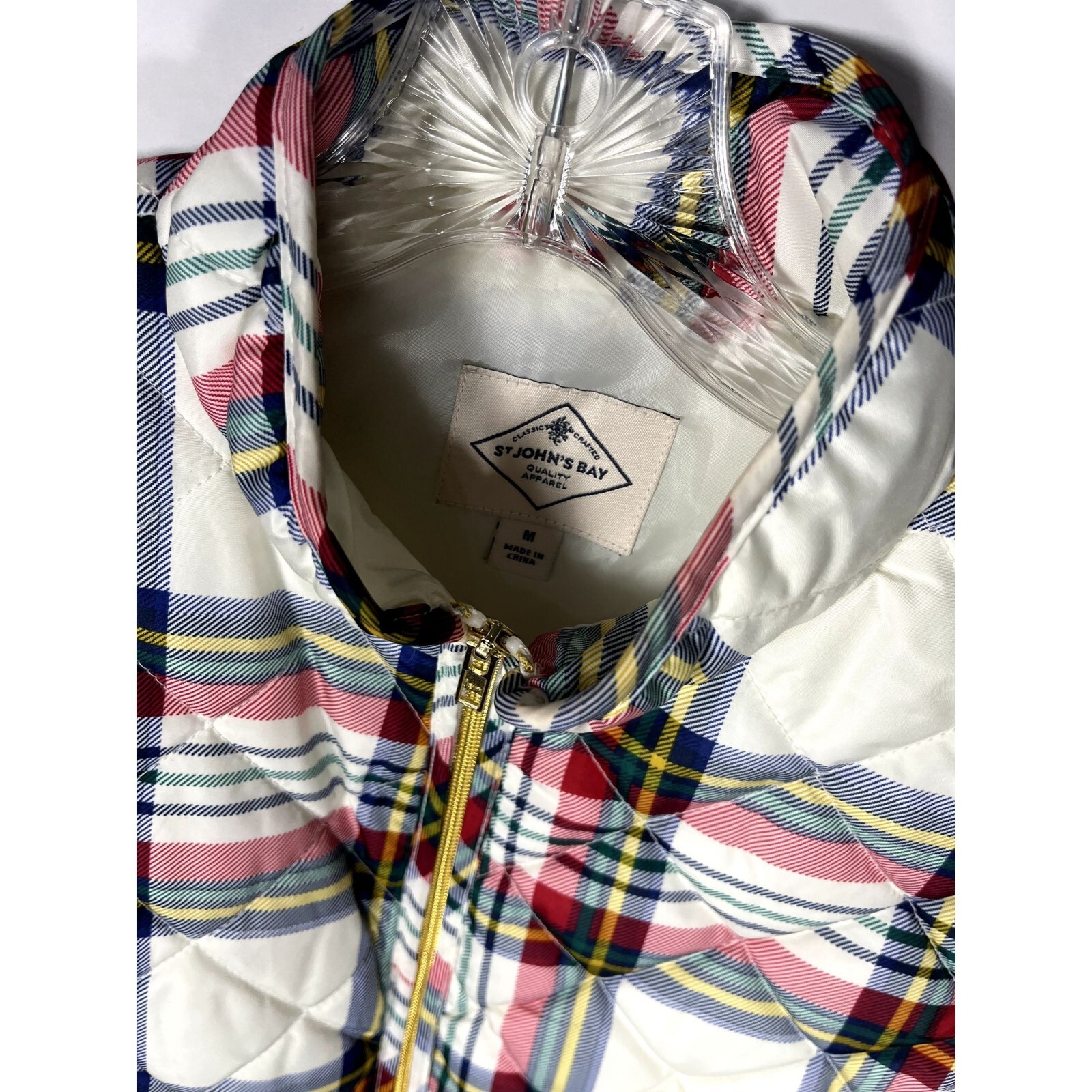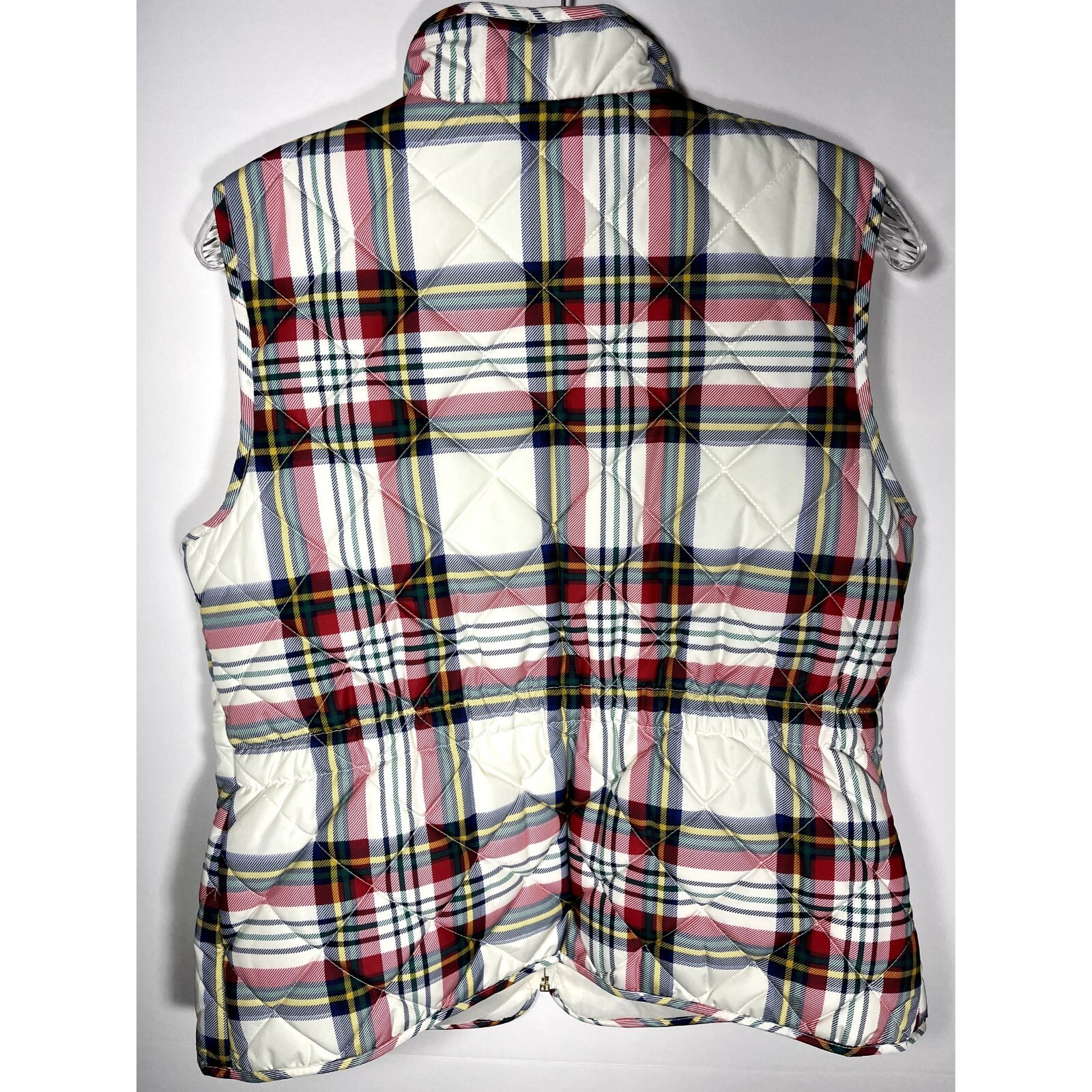 St. John's Bay plaid MED size puffer vest white pink blue green yellow w/ gold