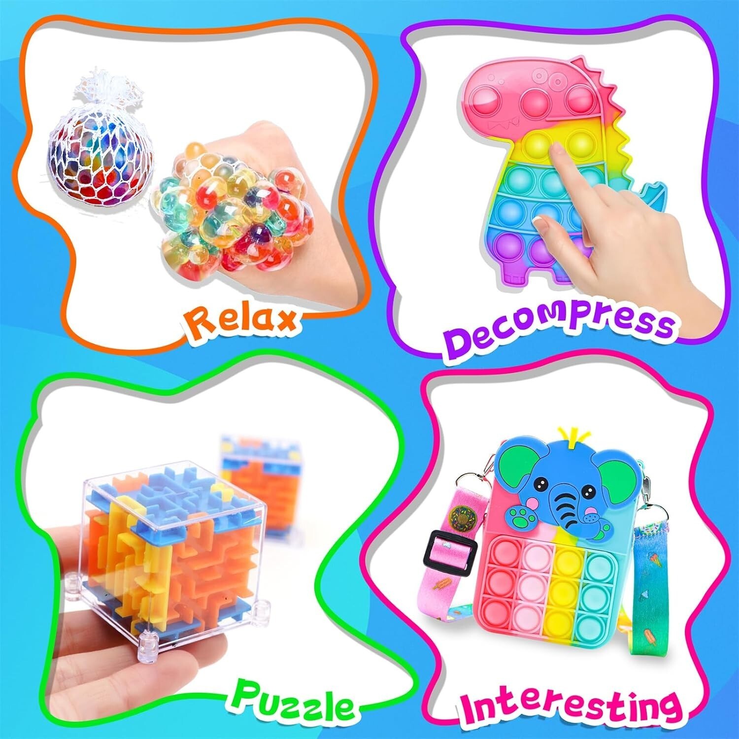 Explore our pack of 60 vibrant sensory toys designed to captivate children's attention, foster creativity, and stimulate thinking. Compact and portable, these toys are perfect for on-the-go relaxation during school breaks, parties, or library visits. Made with high-quality, safety-tested materials, they are suitable for both kids and adults. Ideal as party favors, classroom rewards, or prize box fillers, these colorful toys promise long-lasting fun and sharing enjoyment.