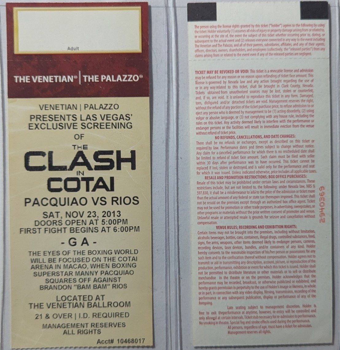 A pair of ticket stubs for the Las Vegas' Exclusive Screening of The Clash in Cotai Paquiao vs Rios Sat., Nov. 23, 2013 held at the Venetian ballroom.