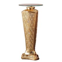 Product description: Transform your living space with this stunning Luxury Geometric Plant Stand by Interoknack. Standing at an impressive 33.9 inches tall with a compact 11.4-inch triangular footprint, this gold pedestal table combines modern geometry with classic elegance. The exquisite resin construction features intricate diamond reliefs and sparkling faux crystal insets that catch the light beautifully, adding a touch of opulence to any room. The sturdy round glass top provides the perfect platform for showcasing your favorite plants, flower arrangements, sculptures, or collectibles. Its space-efficient design makes it ideal for corners, entryways, or as an accent piece beside furniture. The durable construction ensures stability while the radiant gold finish complements various interior styles from contemporary to traditional. This versatile pedestal stand serves as both a functional display surface and a statement piece that elevates your home's aesthetic with its sophisticated charm.
