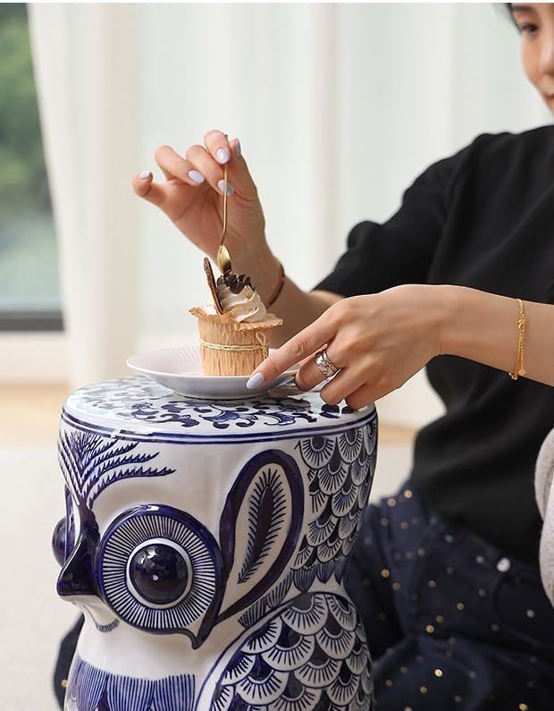 Product description: Elevate your home decor with this striking Blue and White Porcelain Owl Garden Stool from Interoknack. Standing at 16.9 inches tall, this captivating piece seamlessly blends traditional Asian ceramic craftsmanship with contemporary design. The stool features exquisite hand-painted details, from the owl's expressive round eyes to the intricate feather patterns that adorn its entire surface. Measuring 9.4 inches wide by 10.2 inches deep, this versatile ceramic piece serves multiple functions - use it as a distinctive side table, extra seating, or an artistic accent in your living room or entryway. The classic garden stool silhouette showcases flowing blue and white patterns, including detailed wing feathers and scaled chest plumage that demonstrate masterful underglaze painting techniques. The sturdy construction supports up to 250 pounds while adding a touch of whimsy and wisdom to any interior space. Whether positioned as a standalone statement piece or incorporated into a curated collection, this owl garden stool brings both practical functionality and artistic charm to your home.