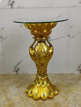 Product description: Transform your living space with this exquisite Luxury Plant Stand by Interoknack. Standing at 28.7 inches tall with a 13.4-inch diameter glass top, this gold resin pedestal features a stunning peacock motif adorned with vibrant blue gem accents. The intricate feather patterns and meticulous hand decoration create a statement piece that elevates any room's decor. Perfect for displaying potted plants, flower arrangements, or decorative items, this versatile stand fits beautifully beside TV cabinets, in entryways, or as an accent in compact spaces. The sturdy construction combines a heavy base with thick tempered glass, ensuring stability for your cherished displays. Whether placed in a formal living room or used to create a focal point in a hallway, this artistic floral pot holder brings luxurious style and traditional artistry to contemporary interiors.