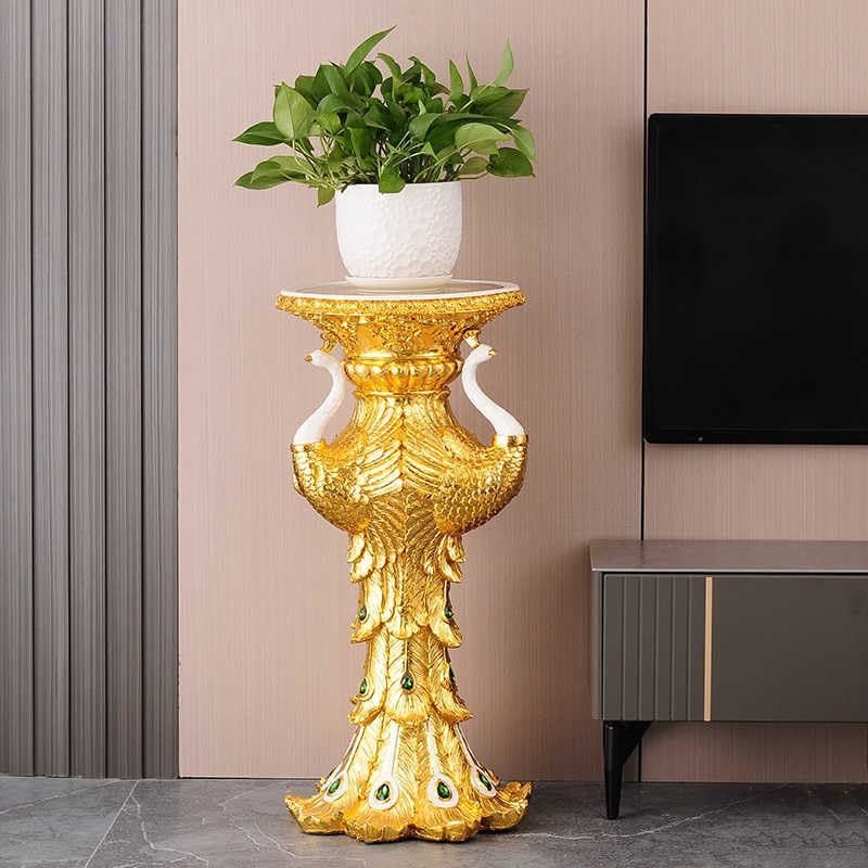 Product description: Transform your living space with this stunning Luxury Golden Peacock Plant Stand from Interoknack. Standing 35 inches tall with a generous 17.7-inch square top surface, this ornate pedestal display captures the majestic beauty of a peacock in full splendor. The intricate design features layered feathers, a regal posture, and a crown-like platform that adds dramatic flair to any room. Crafted from high-quality resin and finished in dazzling metallic gold with green jewel accents, this statement piece combines functionality with artistic elegance. The spacious flat top provides stable support for showcasing your favorite plants, flower arrangements, sculptures, or decorative items. Perfect for enhancing entryways, living rooms, or formal spaces, this non-slip heavy-based stand brings instant glamour to both traditional and contemporary interiors. Its meticulous craftsmanship and eye-catching design make it an ideal focal point for upscale homes, hotels, or offices seeking to create a lasting impression.