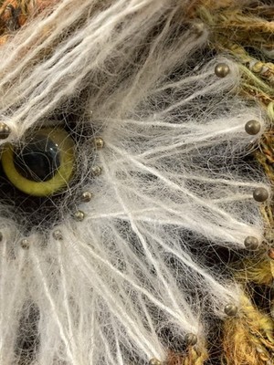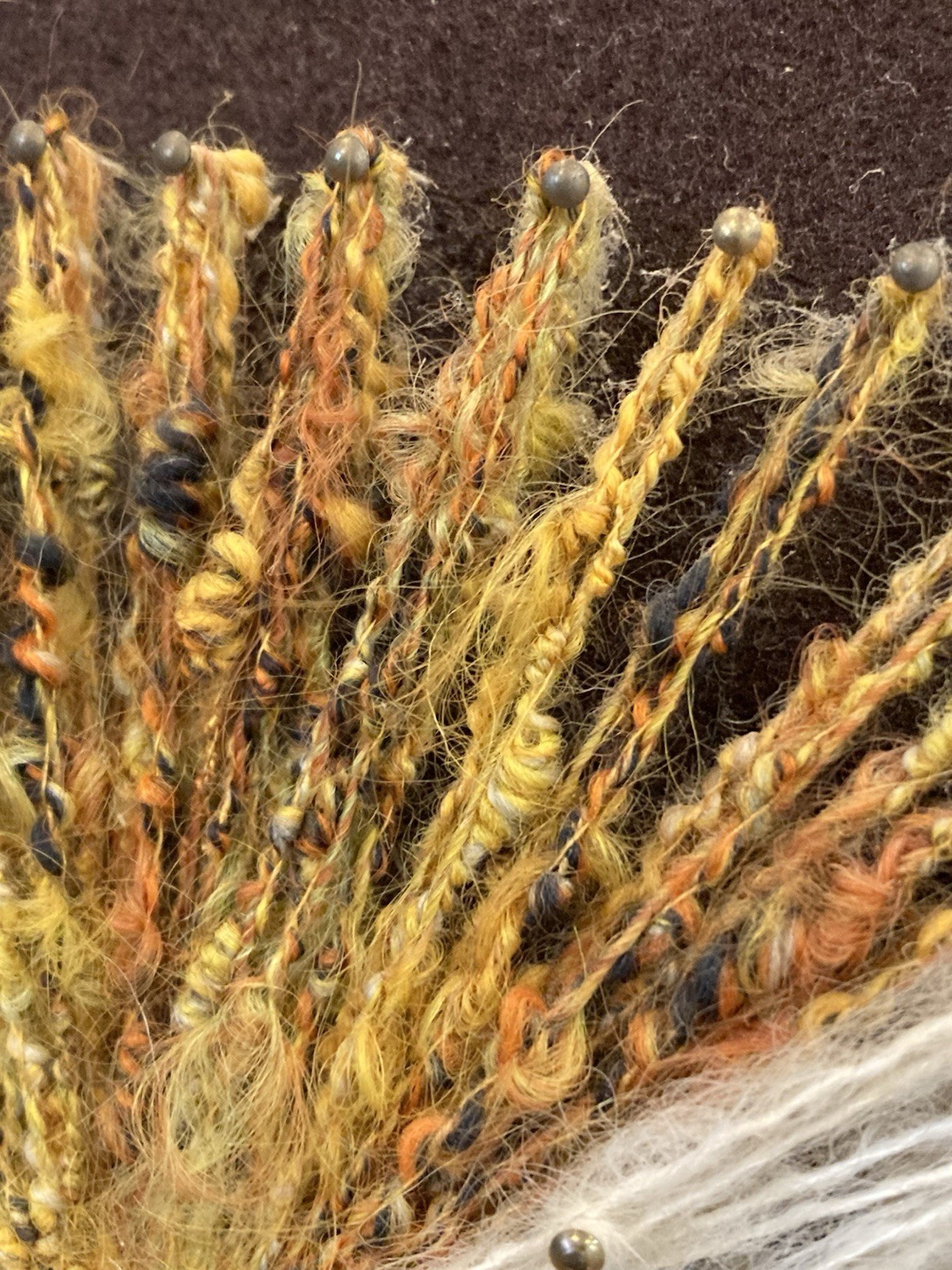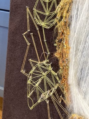I love that this owl is made not just with string but with textured wool yarns; white mohair or angora? and textured oranges boucle ; the leaves are string art.