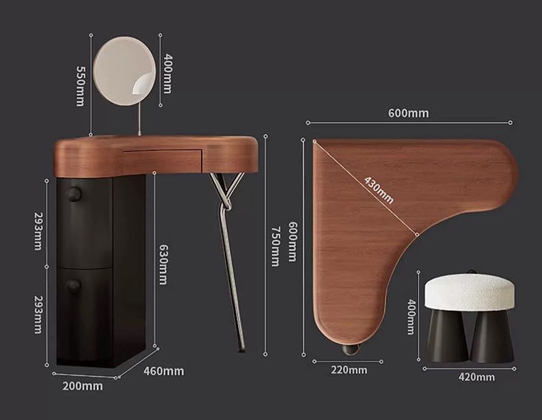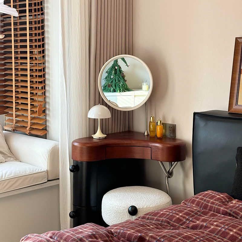 Product description: Transform your compact living space with this elegantly designed corner vanity set from Interoknack. Crafted from solid wood, this vintage-inspired dressing table maximizes functionality through its smart L-shaped design and thoughtful storage solutions. The set includes a spacious tabletop measuring 23.6 x 23.6 inches, a matching mirror that extends the total height to 45.3 inches, and a comfortable upholstered stool. The integrated storage cabinet, featuring dual drawers and measuring 7.9 x 18.1 x 24.8 inches, provides ample space for cosmetics and personal items. The distinctive mid-century aesthetic, characterized by sculptural metal supports and clean lines, seamlessly blends with various interior styles. Perfect for small bedrooms, studios, or apartment spaces, this corner vanity set combines practical storage with sophisticated style, making it an ideal solution for daily grooming routines while preserving precious floor space.