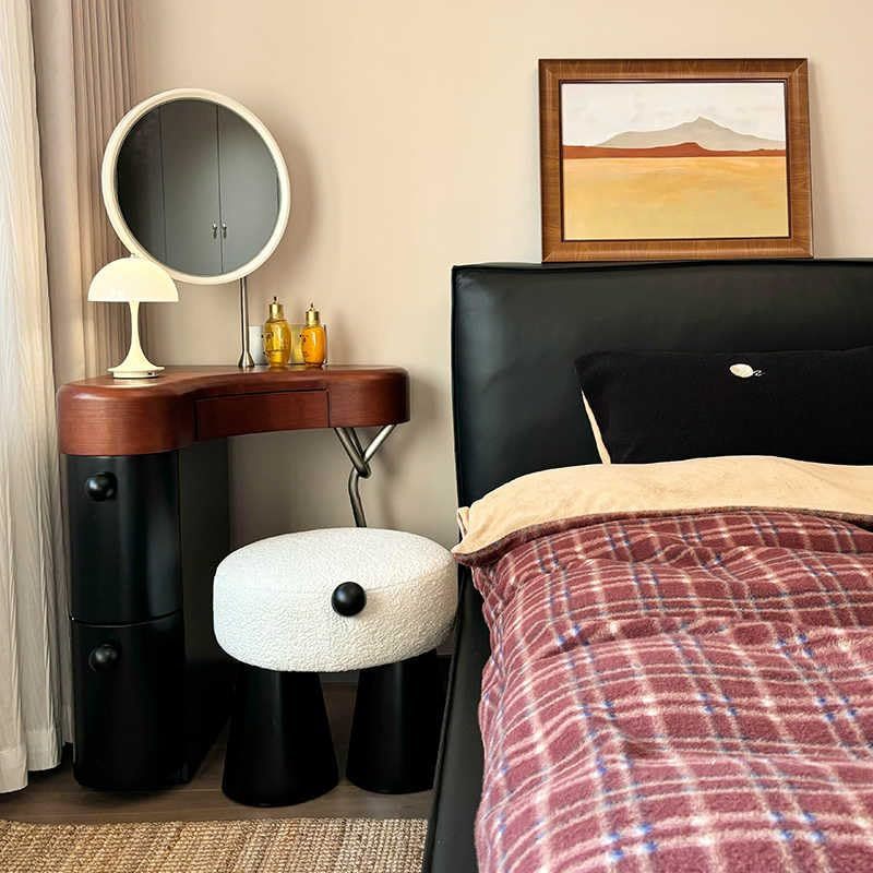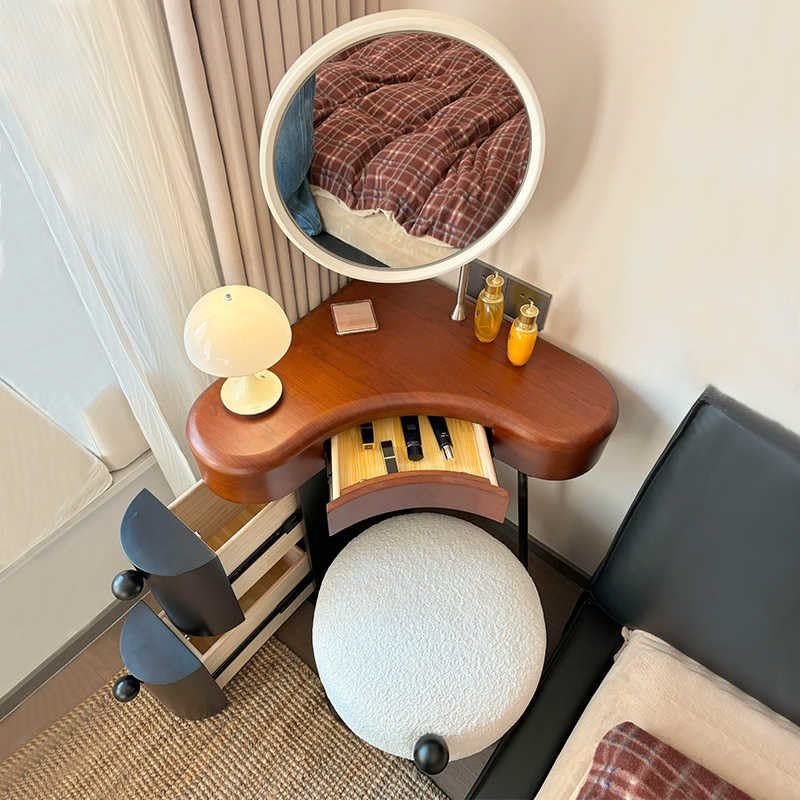 Transform your compact living space with this elegantly designed corner vanity set from Interoknack. Crafted from solid wood, this vintage-inspired dressing table maximizes functionality through its smart L-shaped design and thoughtful storage solutions. The set includes a spacious tabletop measuring 23.6 x 23.6 inches, a matching mirror that extends the total height to 45.3 inches, and a comfortable upholstered stool. The integrated storage cabinet, featuring dual drawers and measuring 7.9 x 18.1 x 24.8 inches, provides ample space for cosmetics and personal items. The distinctive mid-century aesthetic, characterized by sculptural metal supports and clean lines, seamlessly blends with various interior styles. Perfect for small bedrooms, studios, or apartment spaces, this corner vanity set combines practical storage with sophisticated style, making it an ideal solution for daily grooming routines while preserving precious floor space.