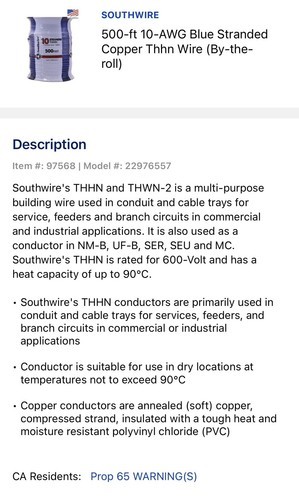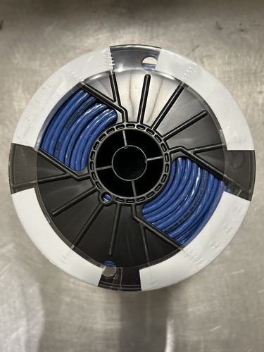 One new roll/spool of blue 10 gauge stranded THHN insulated electrical wire, in sealed package.