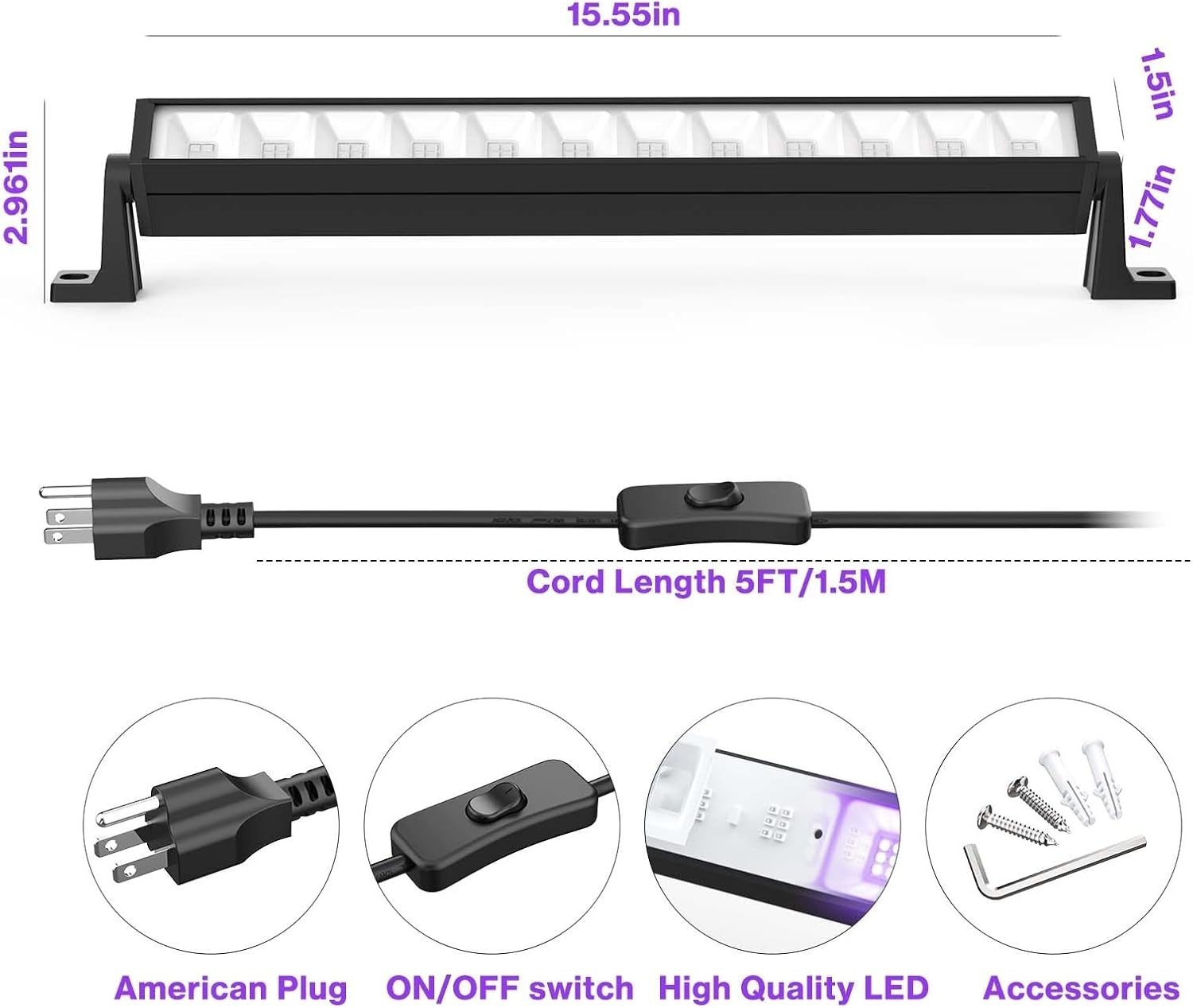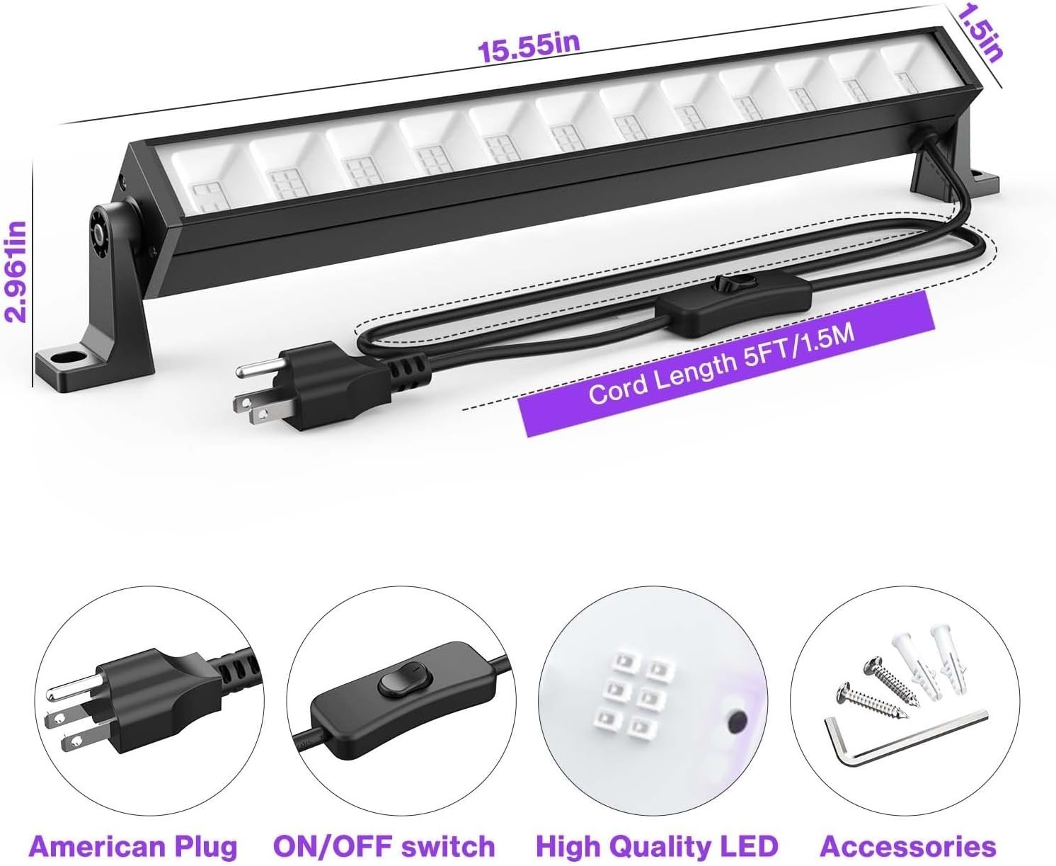 Each black light bar has 68 upgraded high-quality beads which can illuminate 484 Sq.ft Area and the beam angle reaches 120 degrees, which meets the needs of activities, birthday parties, Halloween lights decoration and other occasions that require large areas of black light.