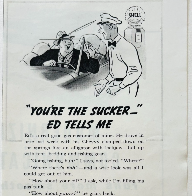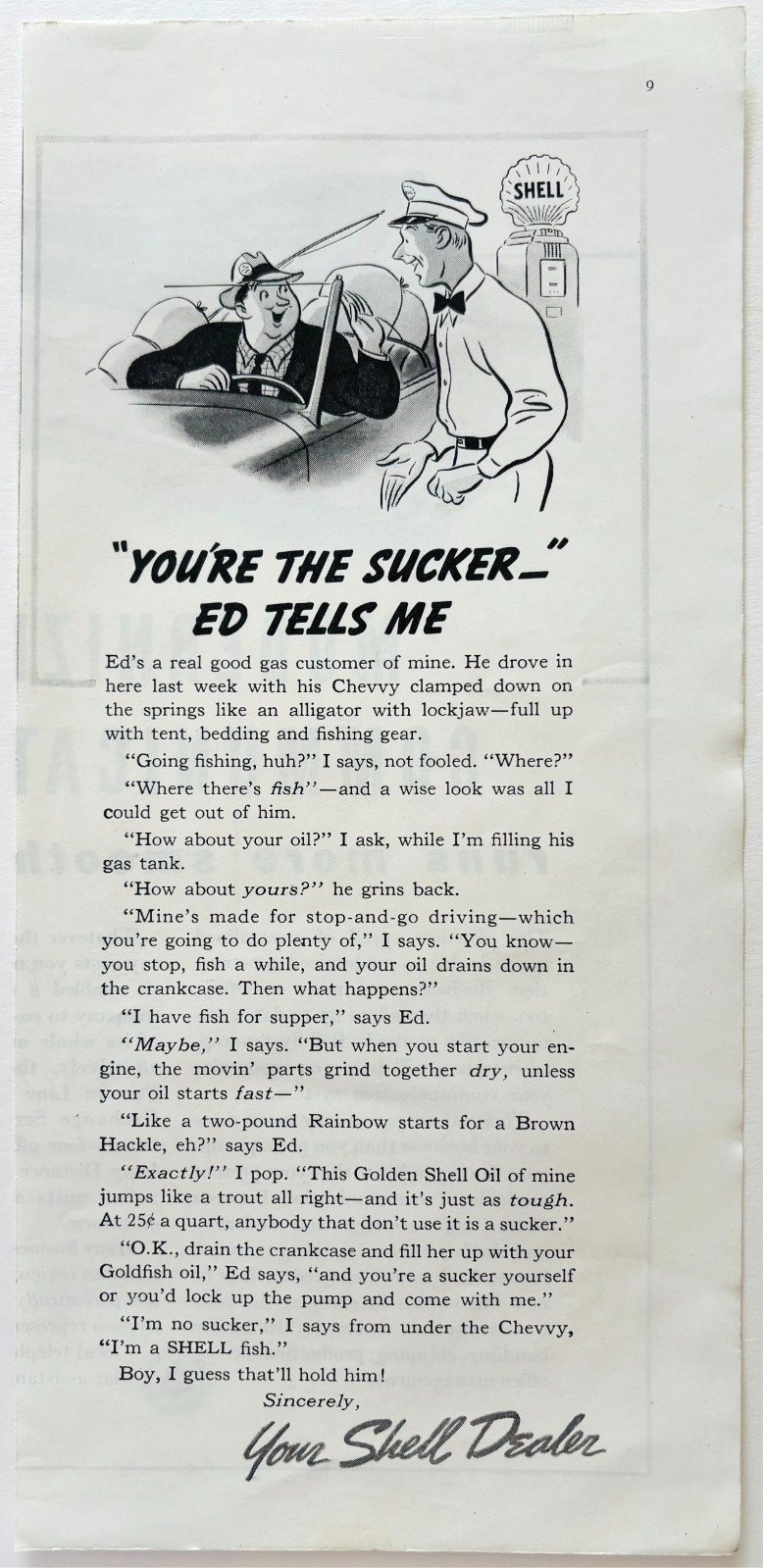 1938 Shell Gasoline And Oil Advertisement Automobilia Going Fishing Gas E90D2