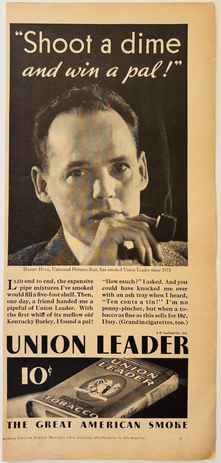 1935 Union Leader Pipe Tobacco Advertisement Henry Hull Smoking Antique E90F1
