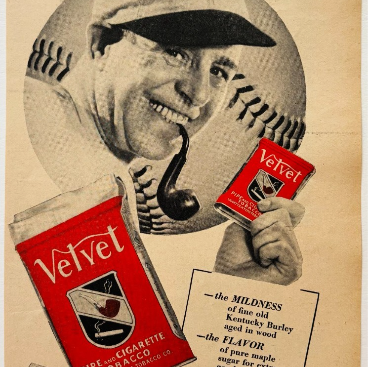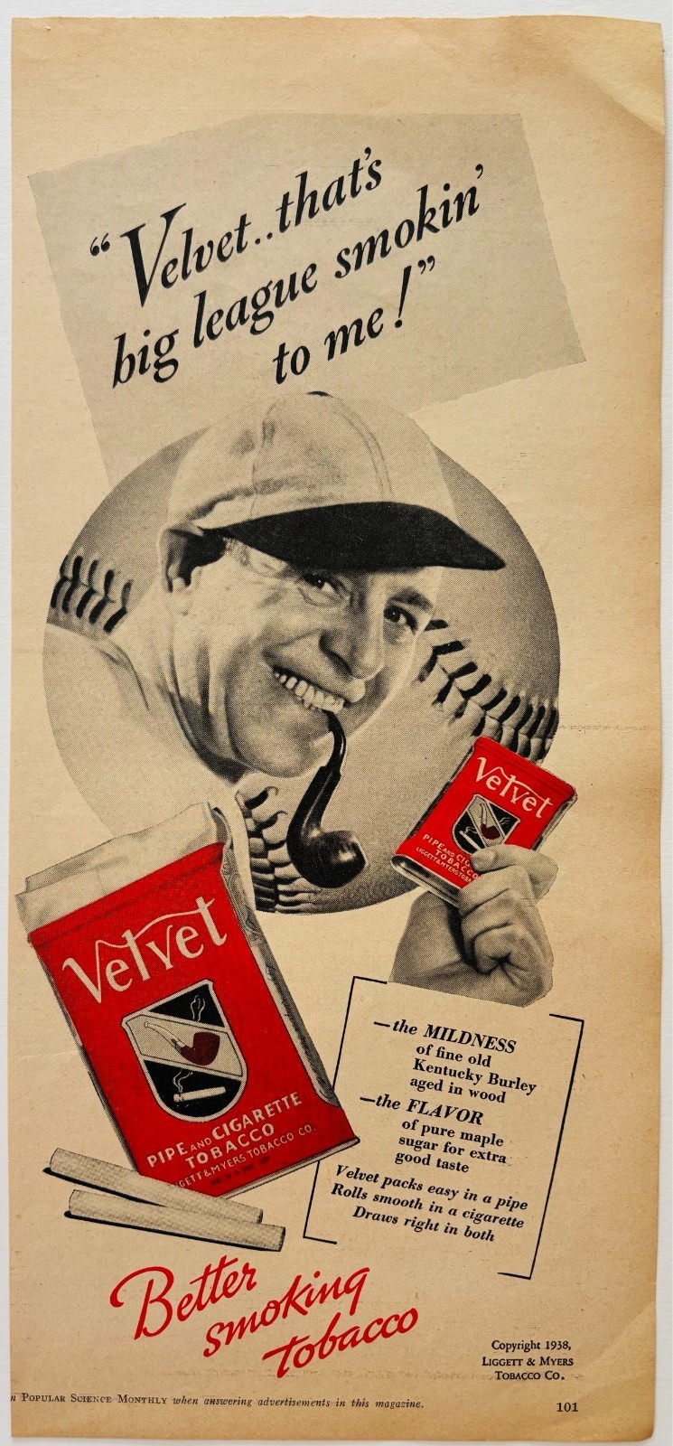 1938 Velvet Pipe & Cigarette Tobacco Advertisement L&M Smoking Baseball E90F2