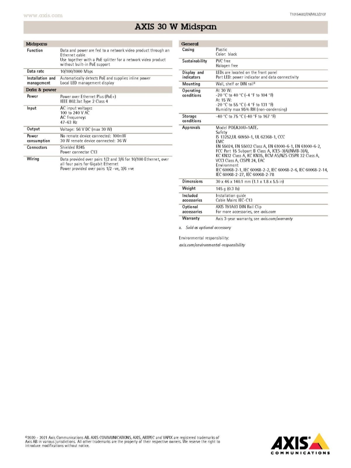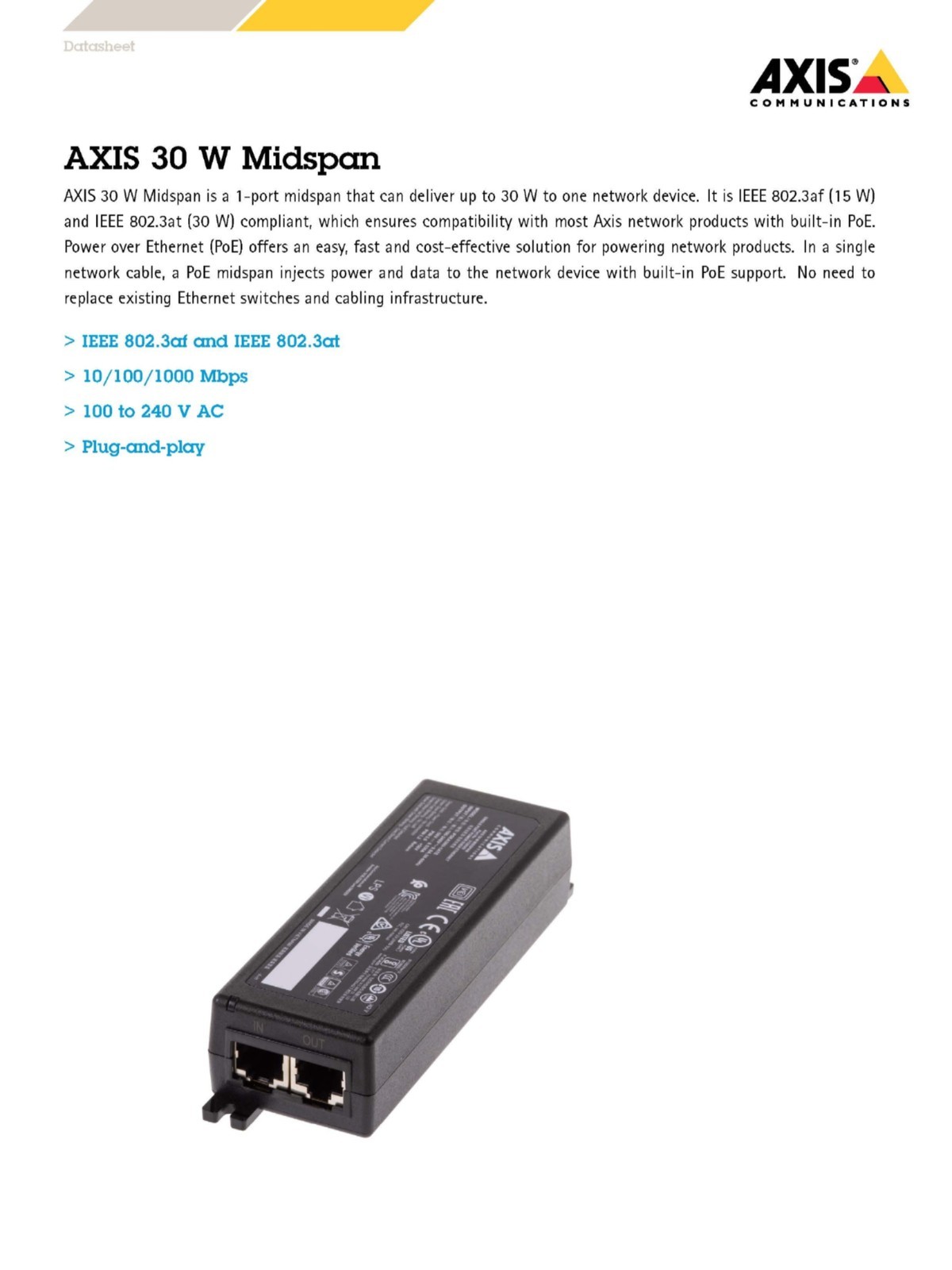 AXIS 30 W Midspan is a 1-port midspan that can deliver up to 30 W to one network device. It is IEEE 802.3af (15 W) and IEEE 802.3at (30 W) compliant, which ensures compatibility with most Axis network products with built-in PoE.