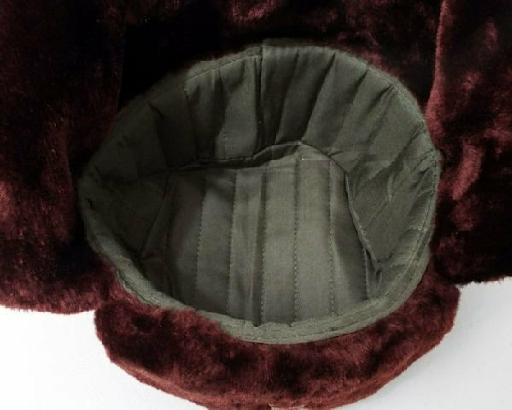 Camouflage de style printemps Ushanka russe avec marteau etoile rouge et embleme de faucille (taille 60 cm). Le chapeau est fait de fausse fourrure et a un haut camo. Les cache-oreilles peuvent etre portes vers le bas pour etre noues sur le dessus.