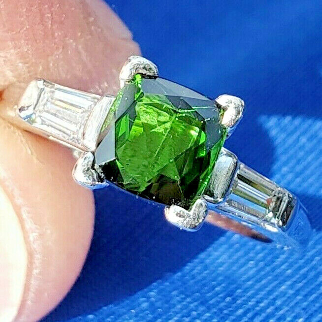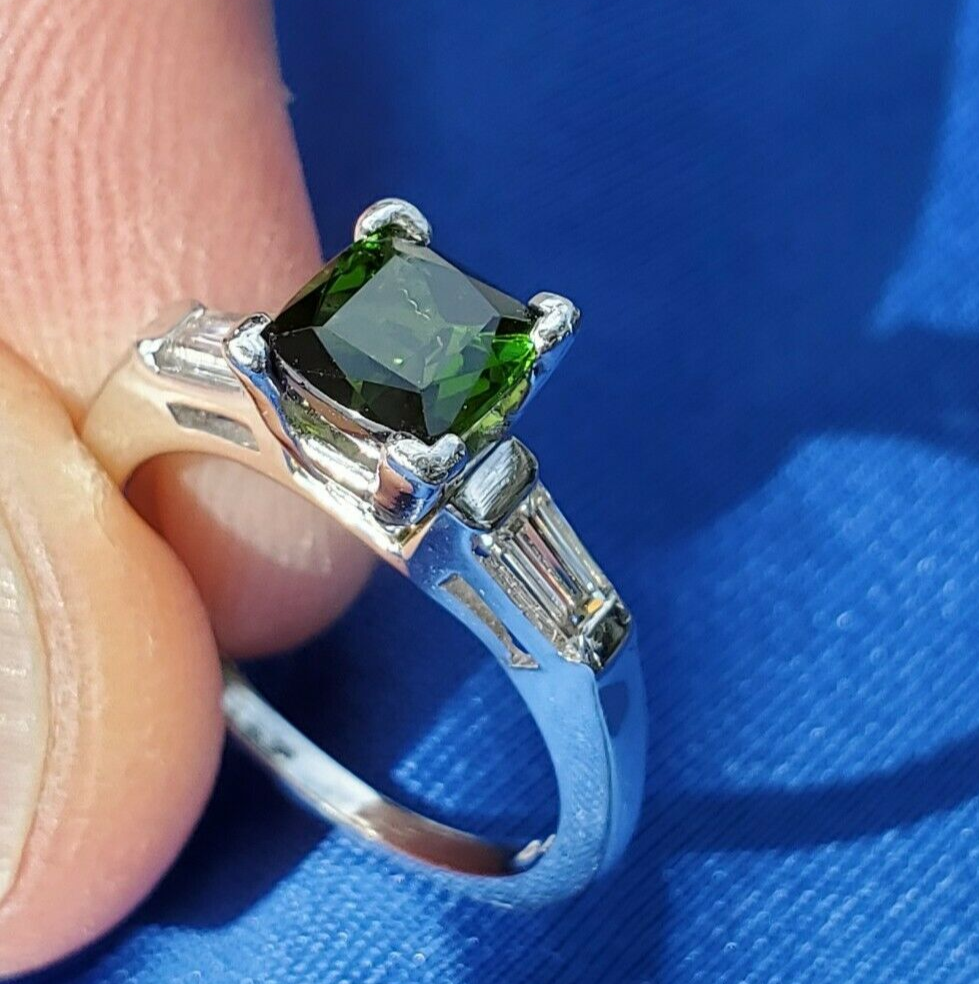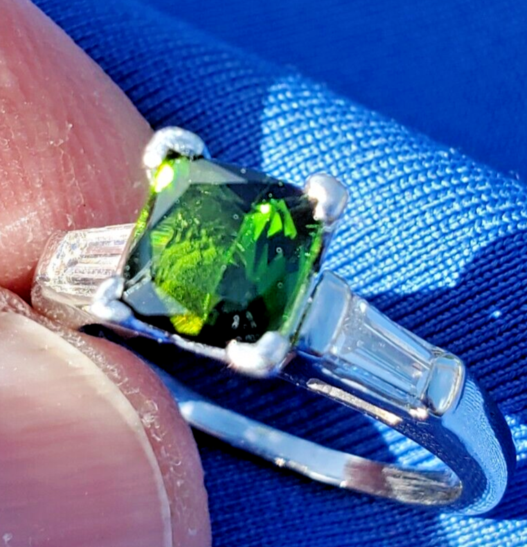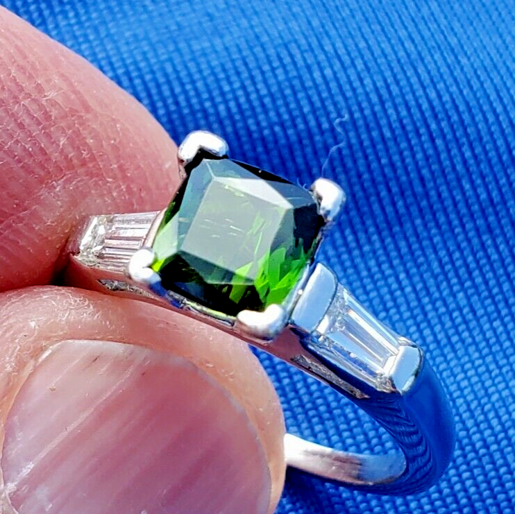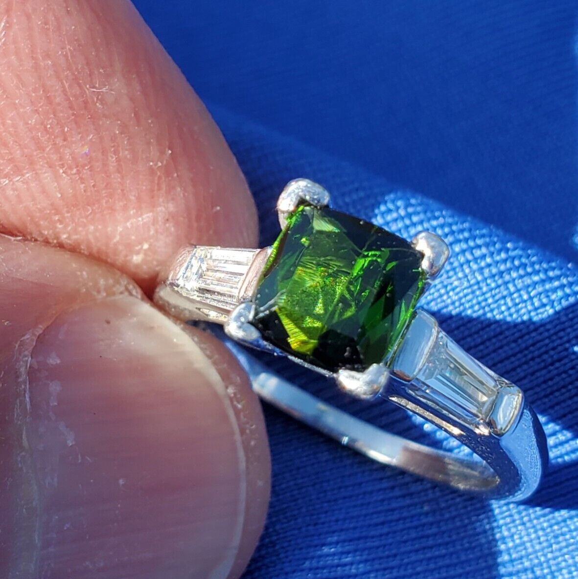 Earth mined Tourmaline Diamonds Deco Engagement Ring Platinum Solitaire Bridal