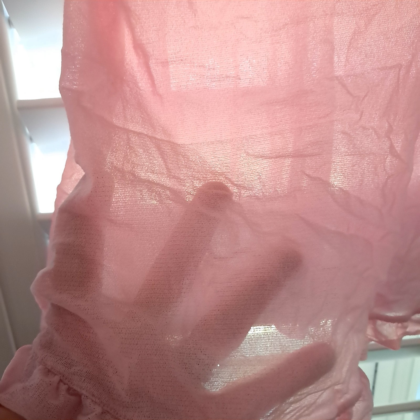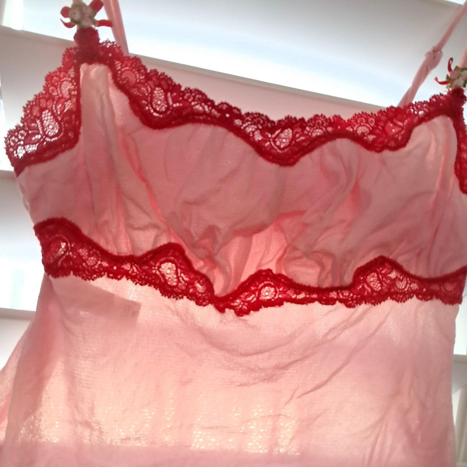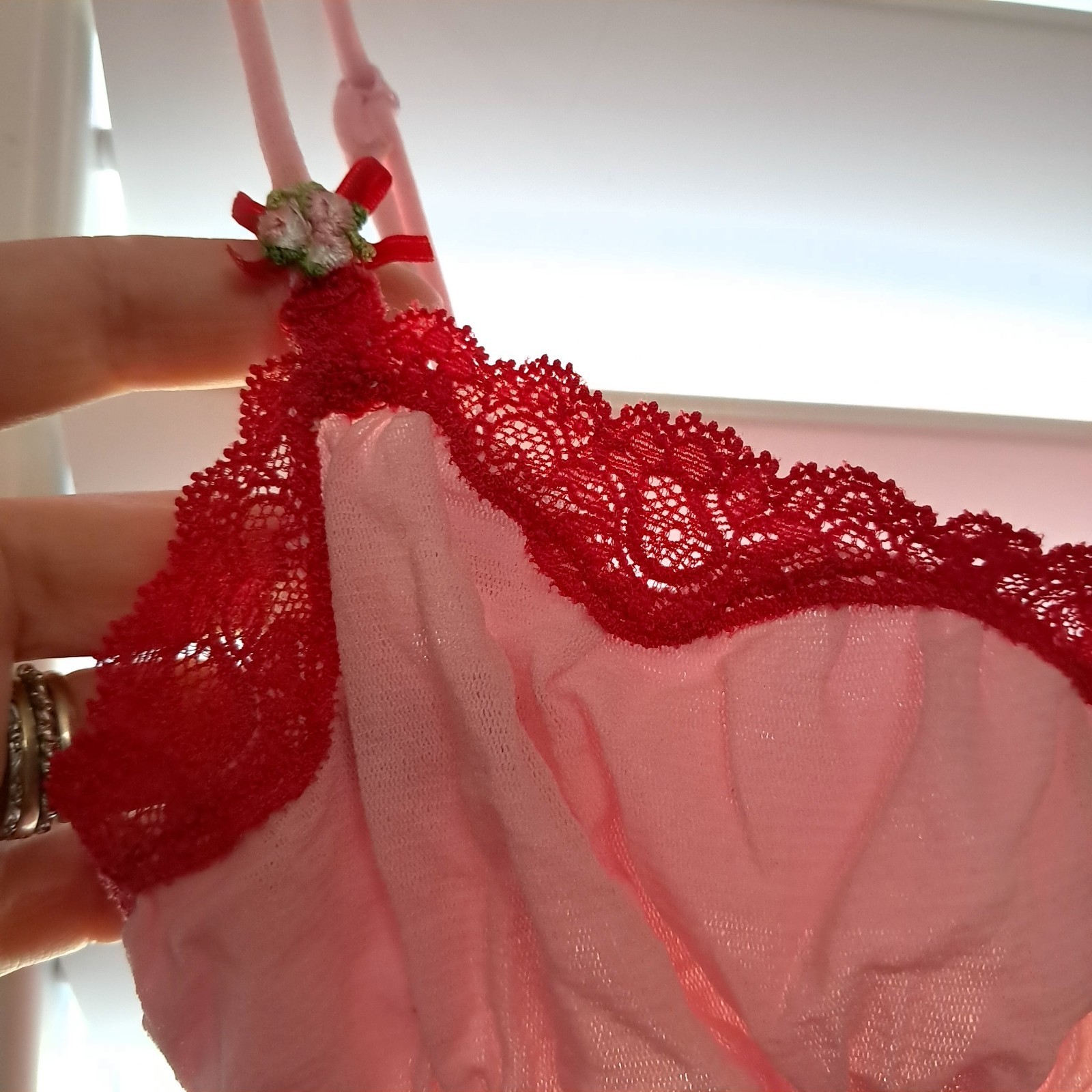 Sheer mesh top. Pink with red lace details and little rosettes on the straps. Adjustable straps. Vintage.