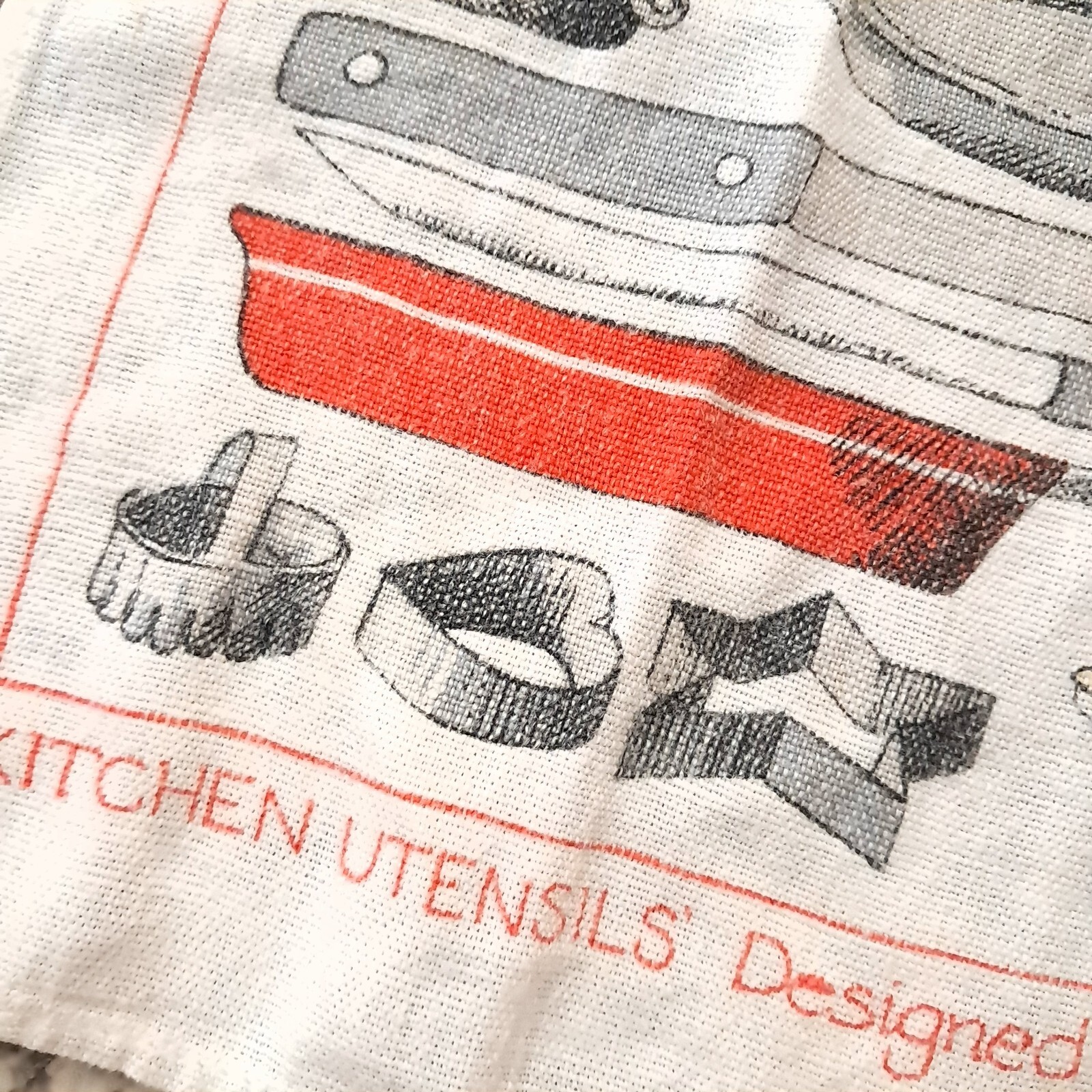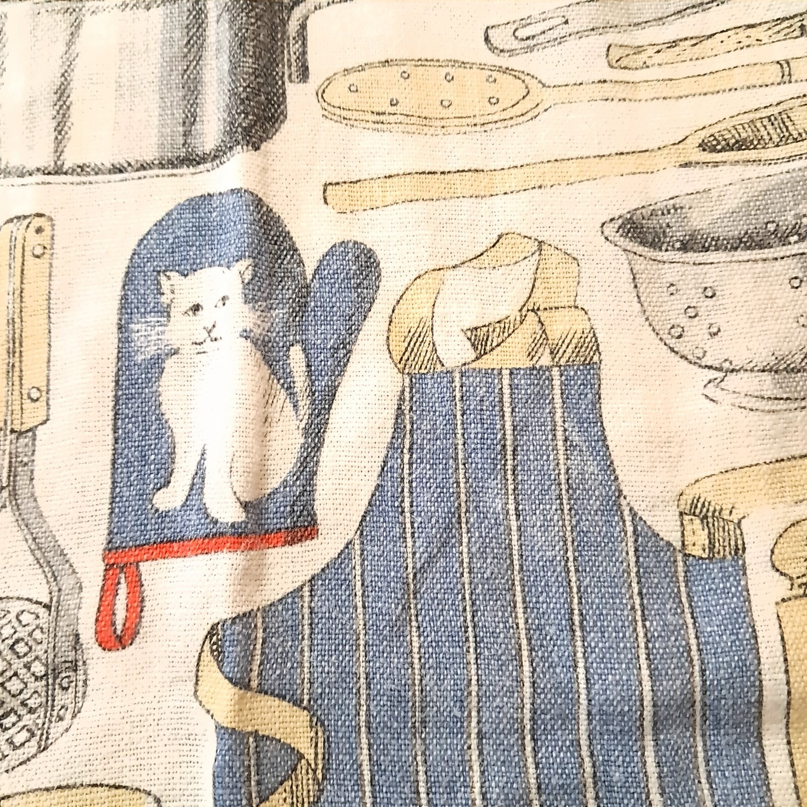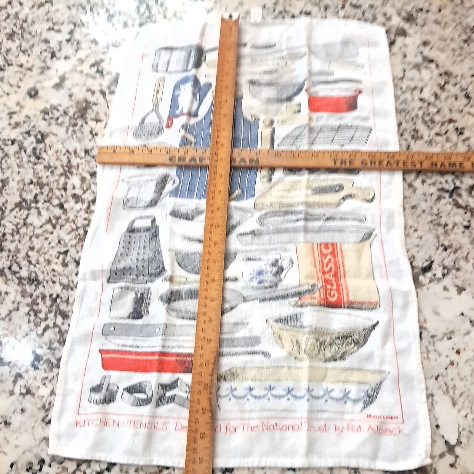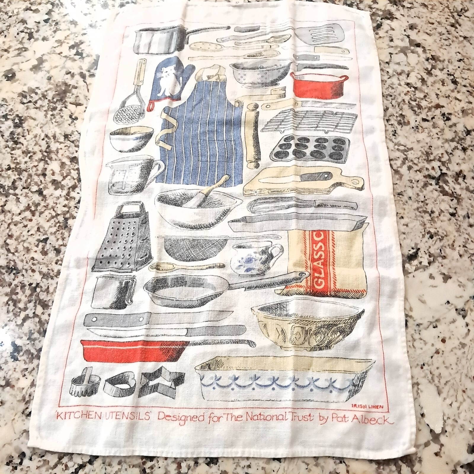 Vintage National Trust tea towel Kitchen Utensils Pat Albeck Irish linen cat