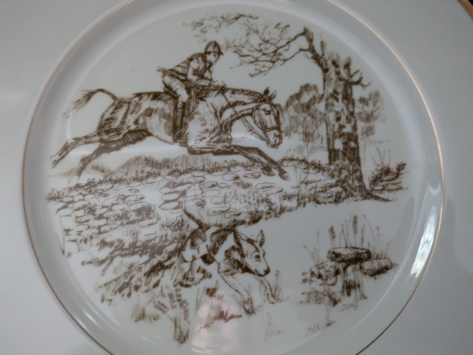 Fitz & Floyd The Chasse Assiette Doré Bord Cheval Chiens Clôture FF14 10 1/4