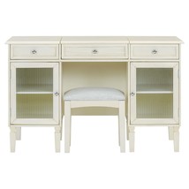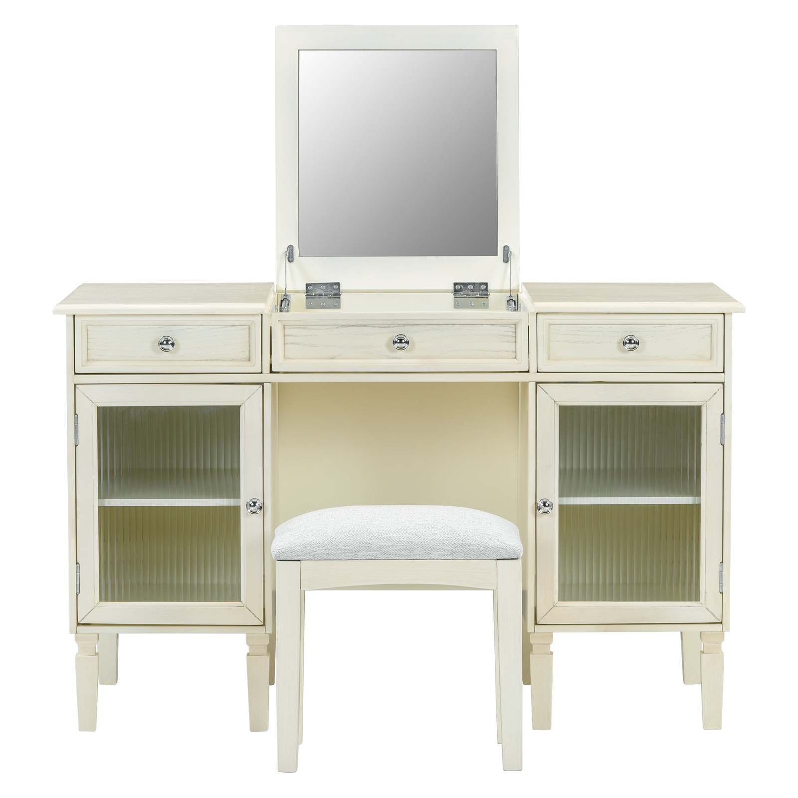 This 46.5-inch multifunctional desk is ingeniously designed with a hidden fold-down mirror in the middle layer. When the mirror is open, it transforms into a stylish dressing table; when closed, it seamlessly doubles as a spacious computer desk. The desk features a generous workspace, small storage compartments in the middle, two side drawers, and two glass-door cabinets, providing ample hierarchical storage to meet all your needs for cosmetics and office supplies. Made from high-quality, eco-friendly MDF material, the desk offers durability and stability, with solid wood legs for the table and stool. The curved corners of the desktop, simple drawer stripes, and elegant white oak finish add a touch of bright luster to any bedroom, regardless of its decor style. Whether you're looking for a versatile piece of furniture for your home office or a chic addition to your dressing area, this desk is a perfect choice for both functionality and style?