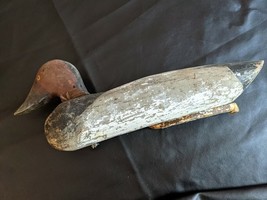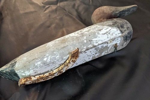 Up for sale is a Vintage Duck Decoy Homemade Folk Art Rustic Fence Post Northern Bay. The Paint is flaking. Head is loose. Base of head has a crack. The weight is a cut horse shoe.