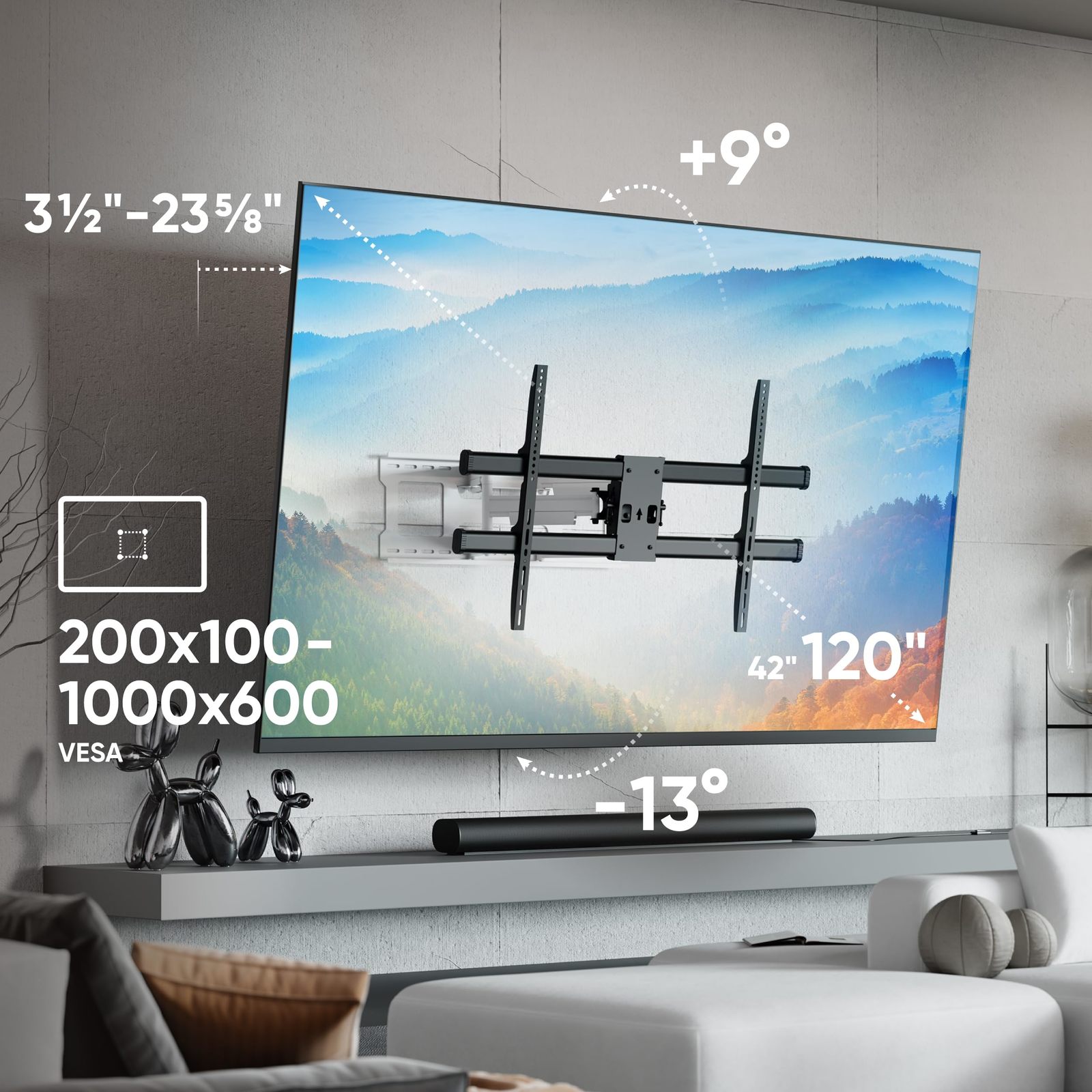 Flexible Adjustments – The articulating TV wall mount provides a tilt range of -13 to +9 for optimal viewing. Our TV wall brackets allow the TV to swivel up to 90 in both directions. The full motion TV mount ensures the screen can be adjusted to the perfect angle. The TV mounting bracket is an optimal choice for interactive displays or watching in any room.