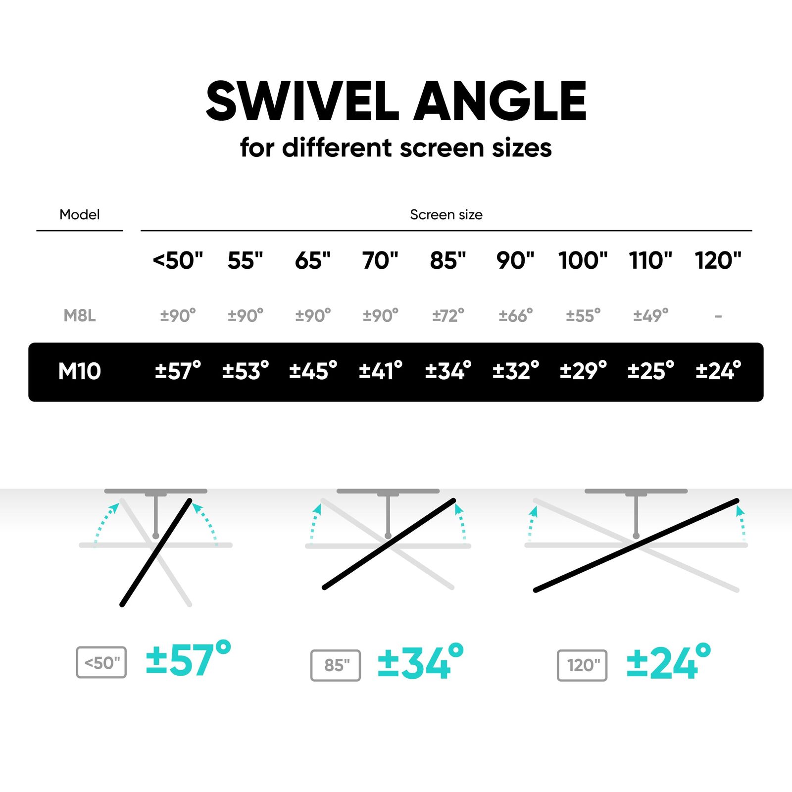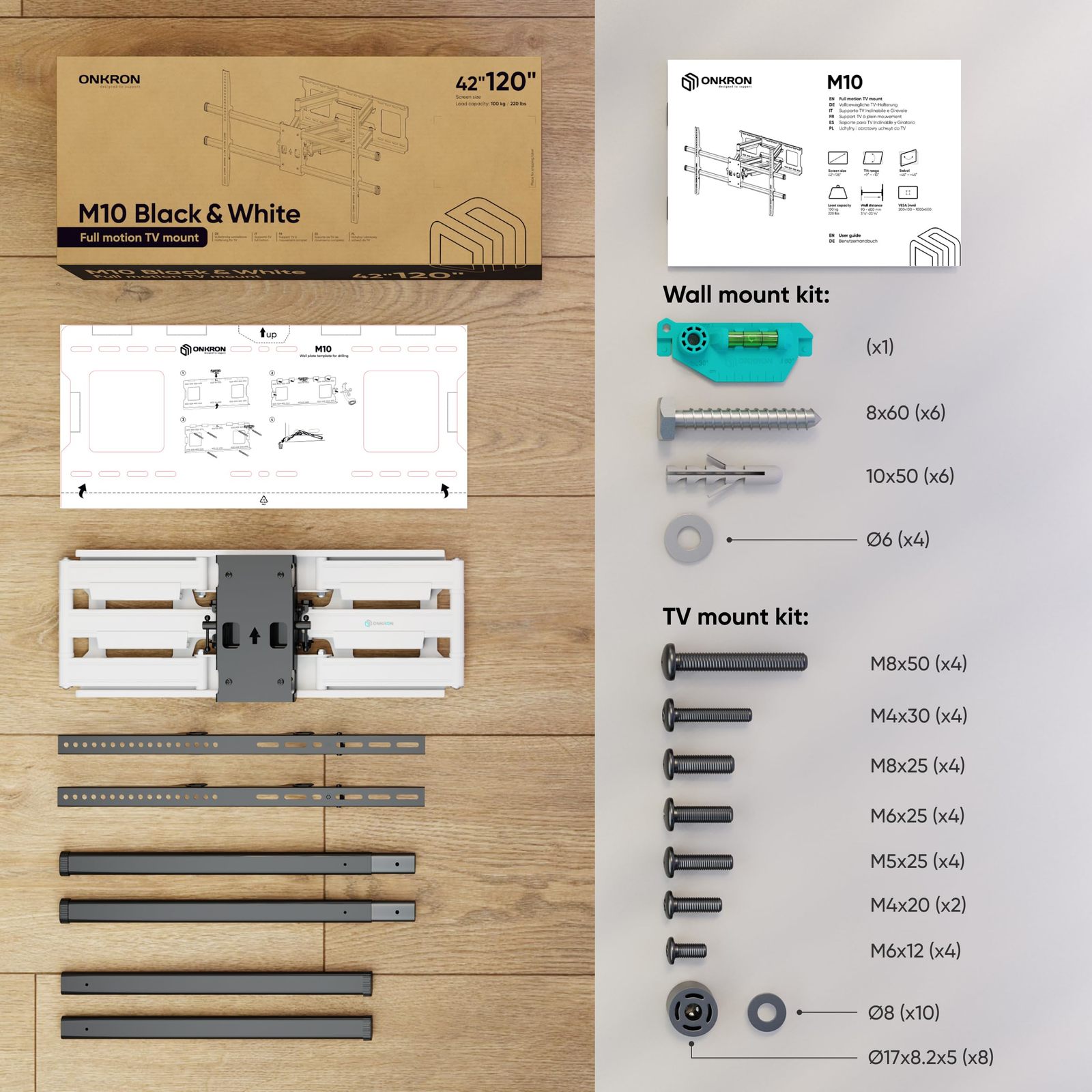 Universal TV Wall Mount – ONKRON M10-BW is a full motion TV wall mount designed for 42 - 120 inch screens that weigh up to 220 lbs. Wall mount for TV supports a wide range of VESA patterns, from 200x100 mm to 1000x600 mm. The TV swivel wall mount is suitable for home, office, or commercial installations.