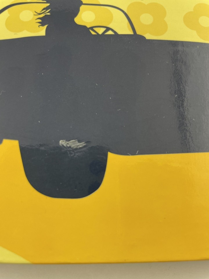 Front has bright yellow background with deeper yellow geometric flowers. A girl with flowing hair drives a mustang convertible down the road with flowers coming out the exhaust pipe. Graphic is in black with a vinyl look. Has the words Memory Lane on the front cover.