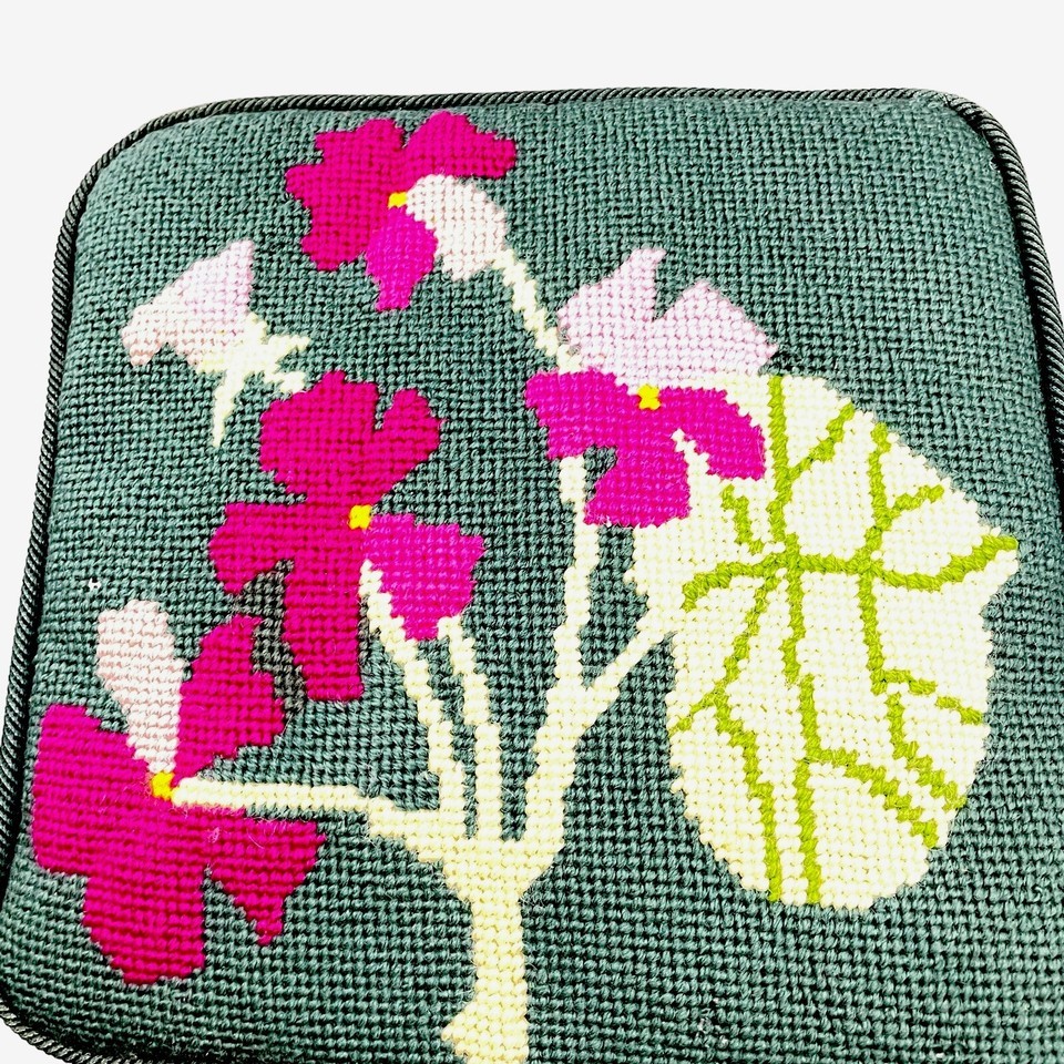 Vintage Kitchen Hot Pad Finished Cross Stitch Corduroy Back Green Floral 10"x10"