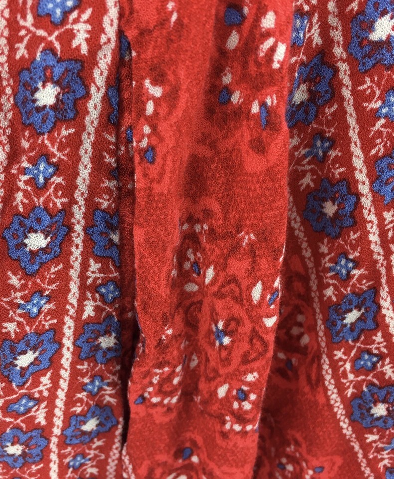 Fun in the summertime! I Deep v-neck 5 button romper in red, with blue and white ikat floral design. Front can be open to waist. Keyhole opening on back from neck to waist. Use with or without matching cloth belt. One loop at side is missing. No holes or stains. Zipper in back works great.
