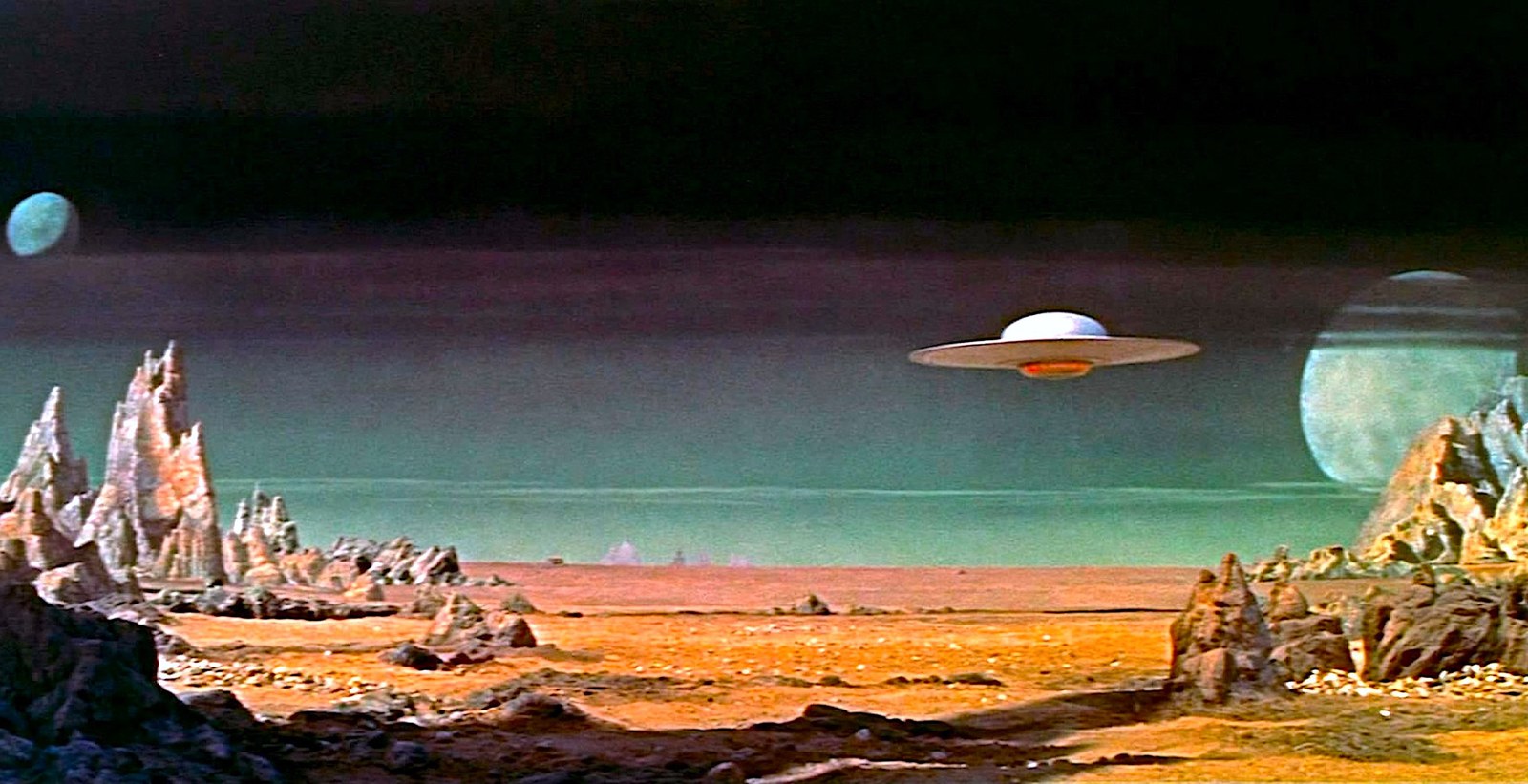 The C-57-D spaceship comes in for a landing on Altair 4 in this widescreen scene from the classic 1956 sci-fi tale.