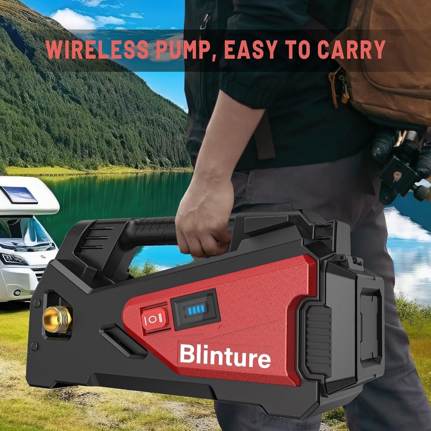 Blinture cordless water pump is a battery operated water pump, that can compatible with Milwaukee 18V 2Ah-5Ah(Even 8Ah can be used, but the battery compartment cover cannot be completely closed) battery pack ,The water suction pump has a suction lift up to 9 ft, flow 300 GPH, and 48 ft Max head lift, which can meet most of the daily uses.