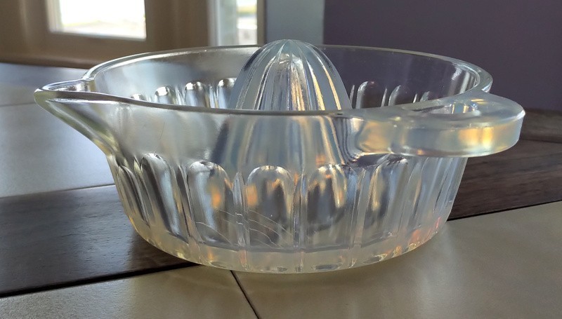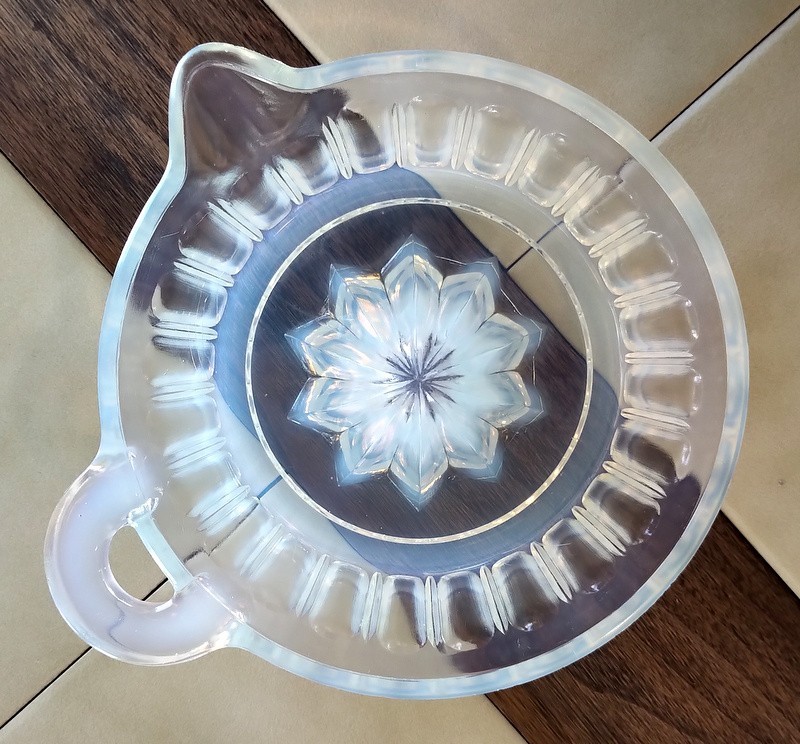 Opalescent glass juicer measures approximately 7.25" L (with handle) x 2.25" H.