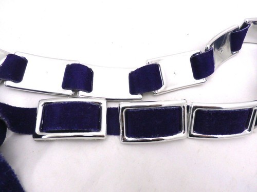 Soft dark purple vintage suede belt woven through twelve silver plastic buckles. Adjustable and tie to close.