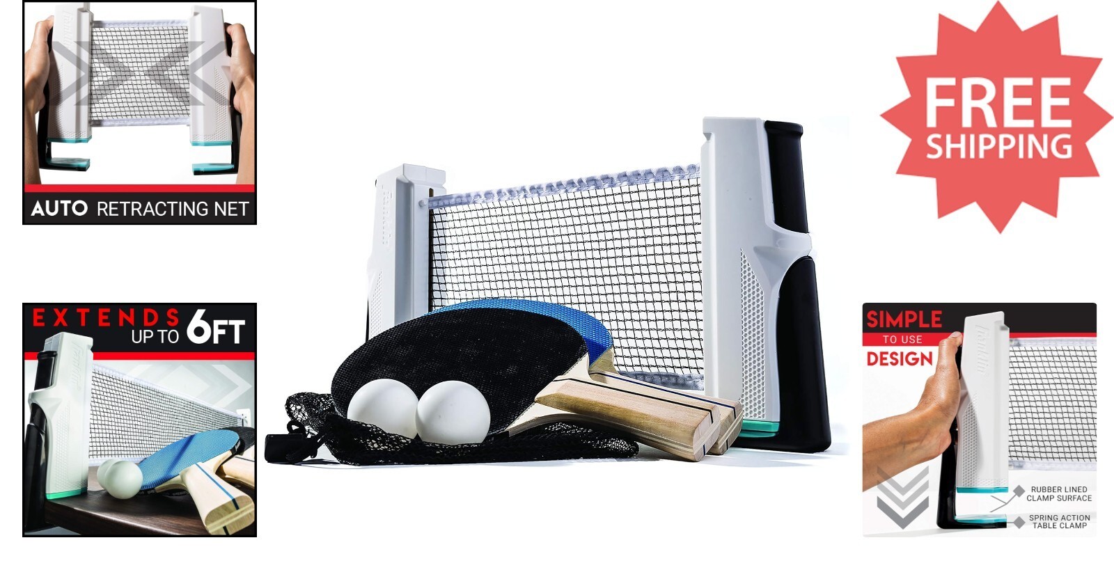 Sturdy Retractable Net: The integrated net stretches easily and securely attaches to any table with robust clamps.