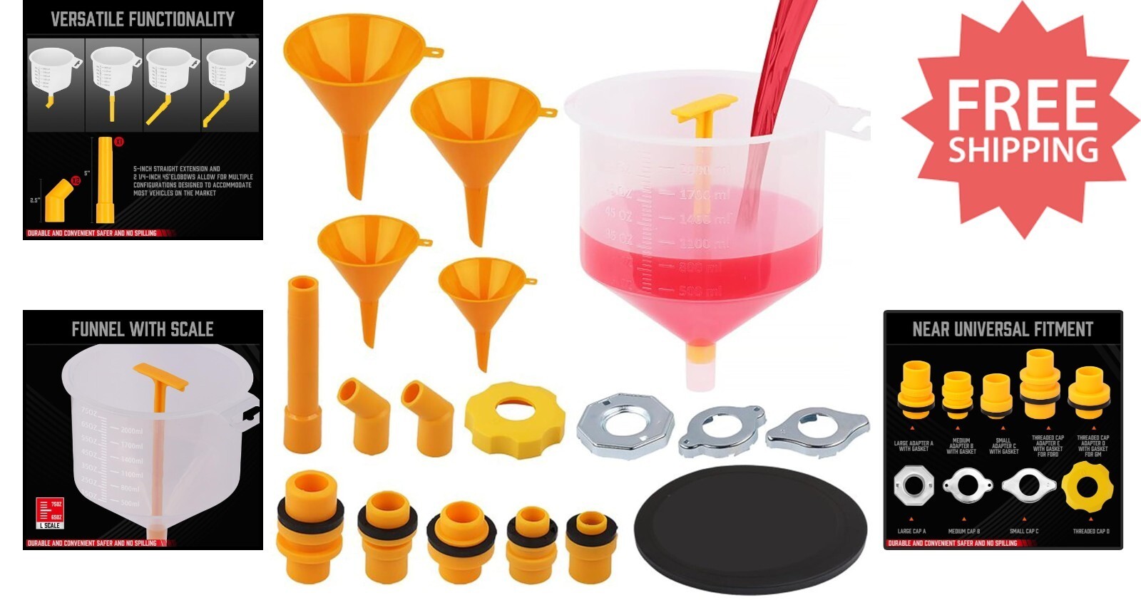 Don't let messy coolant refills ruin your automotive maintenance routine. With our 19-Piece Spill-Free Radiator Funnel Kit, you will effortlessly ensure clean, effective refills that protect your vehicle's cooling system. Its universal compatibility means it will work seamlessly with a range of vehicles, while the innovative spill-free design takes the stress out of the job.