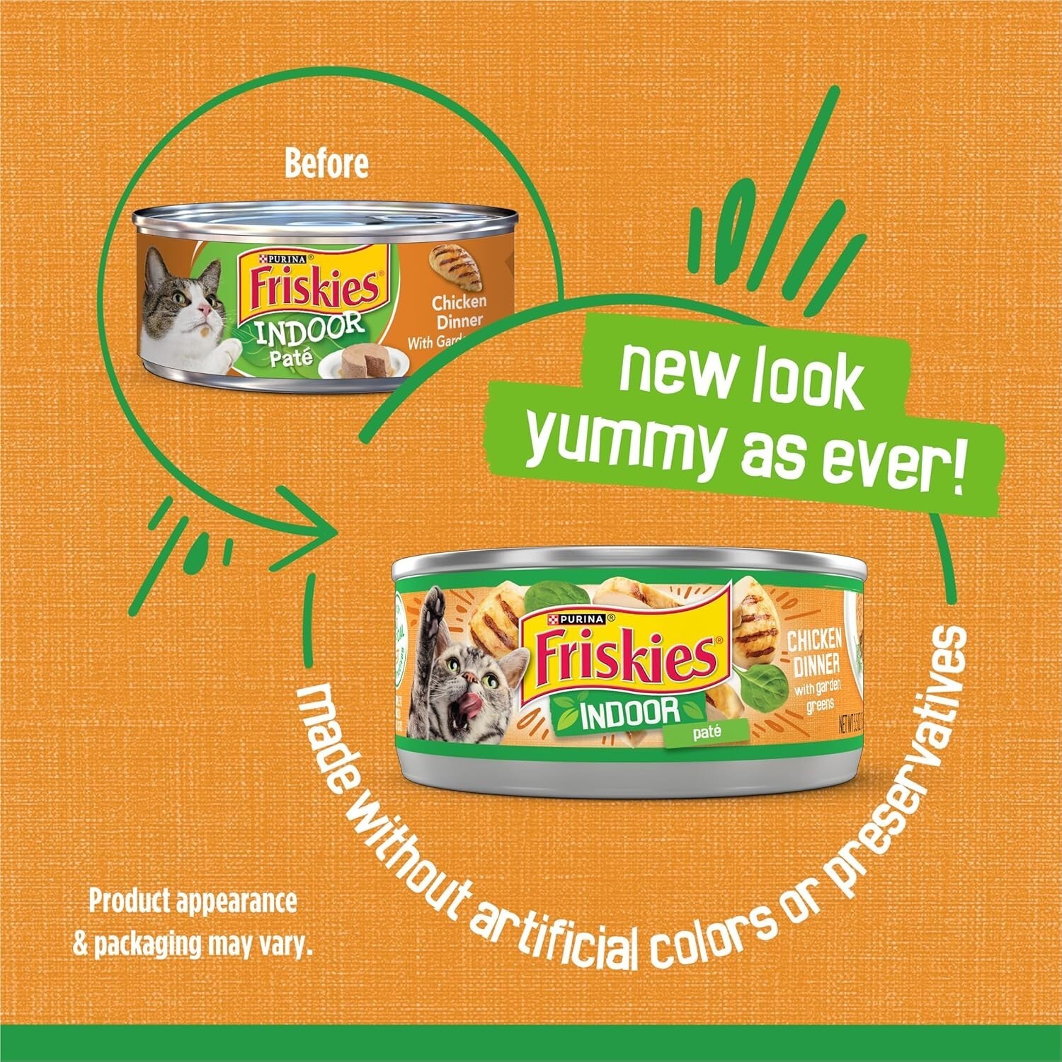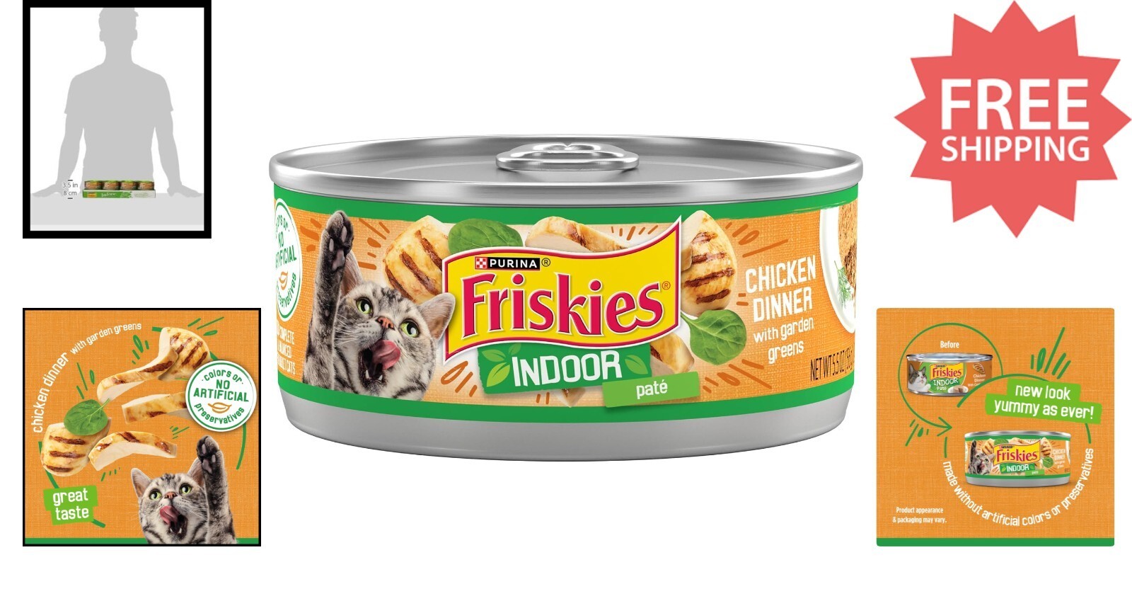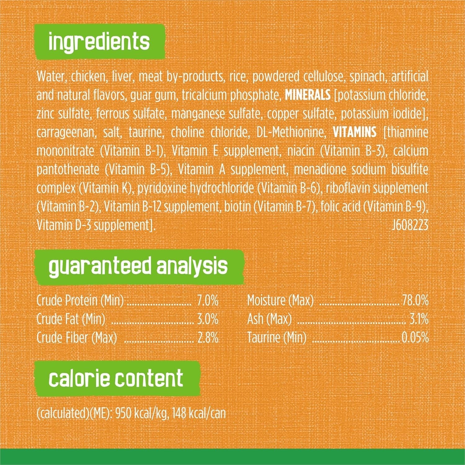 Features: Natural,real chicken,hearty rice,healthy greens,smooth pate texture,enticing aroma,100% complete and balanced,no artificial colors,no preservatives,eco-friendly cans,checked for quality,meets industry standards,formulated for adult cats,satisfies cravings,hydration,muscle strength