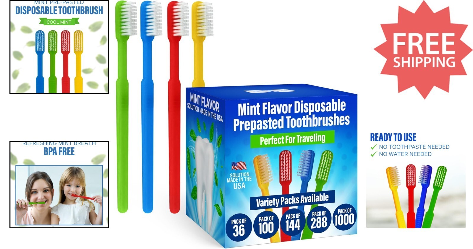 Experience gentle and effective oral hygiene with our 100-pack of disposable, pre-pasted toothbrushes. Designed with soft bristles for comfortable cleaning, each toothbrush features a built-in tongue scraper to help remove plaque and promote fresh breath. Conveniently individually wrapped, these manual toothbrushes require no power and come in a variety of vibrant colors?yellow, red, green, and blue?to suit your style. Perfect for travel, dental offices, or everyday use. To ensure fast and reliable delivery, we work with multiple fulfillment partners and suppliers. Depending on availability and location, your order may ship from different warehouses or arrive in packaging that varies from item to item. Tracking details are typically provided shortly after shipment, and customer satisfaction remains our top priority. Please note that due to carrier policies and regional regulations, certain items may not be eligible for delivery to specific states or territories.