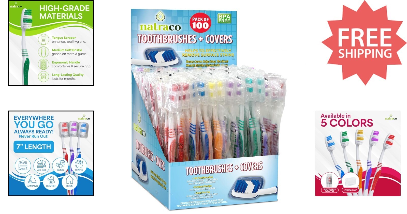 Discover our high-quality toothbrush set that offers unbeatable value. Including 100 individually wrapped, color-coded disposable toothbrushes with ergonomic grips and medium-soft bristles, perfect for deep cleaning, stain removal, and gentle gum care. Each brush features a hygienic cover to keep bristles clean, making them ideal for travel, accommodations, donations, and more. Our commitment is to your smile ? if you have any questions, we're here to help!