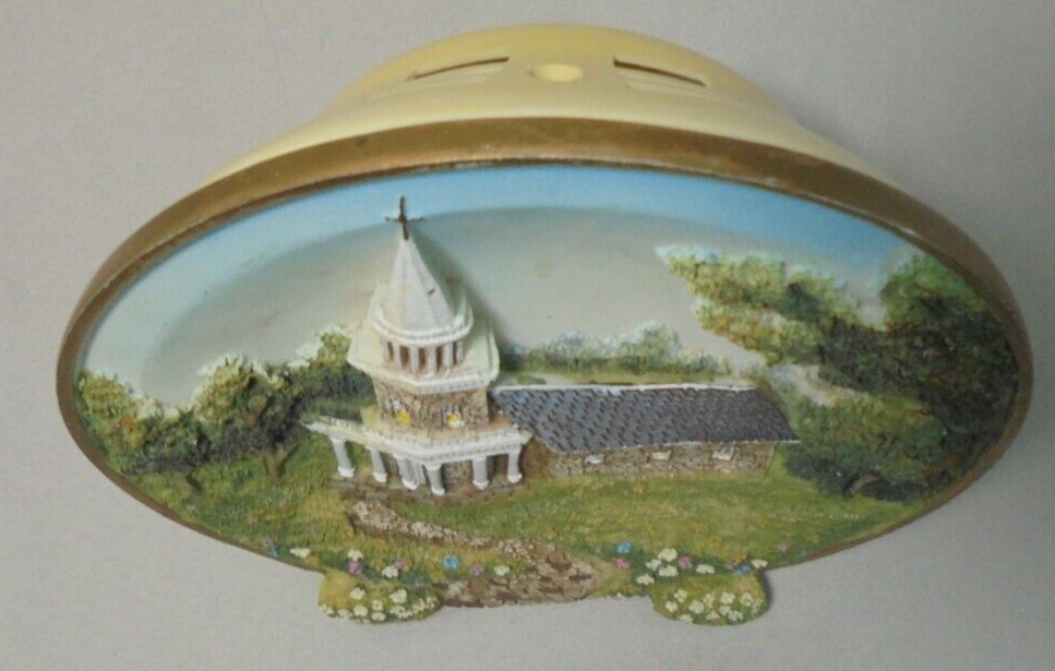 Description: Pretty etched painted 3D church decorative plate. Does not light up (light bulb and wall plug missing, can be replaced if you find the part).