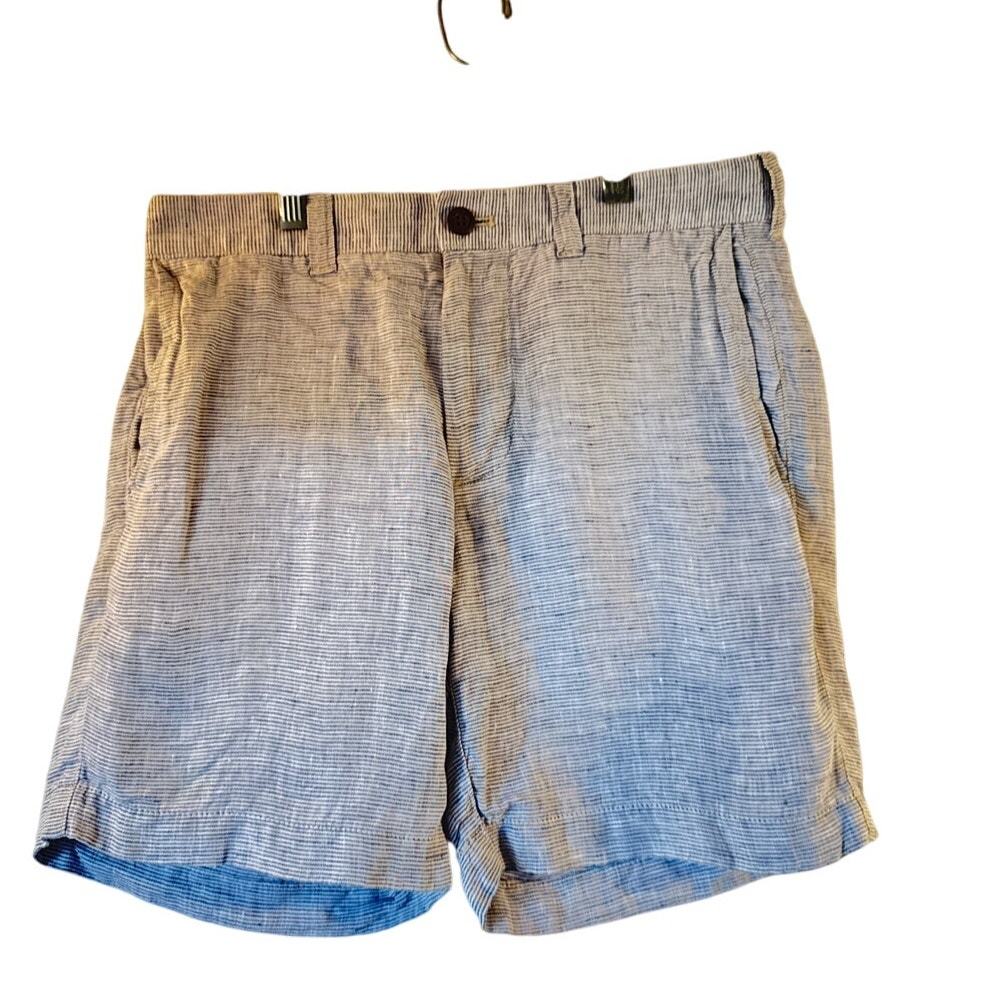 Classic J.Crew men?s casual shorts in a subtle blue-gray striped pattern. Lightweight and breathable fabric, perfect for warm weather. Designed with a button closure, belt loops, and side + back pockets. Stylish yet comfortable for everyday wear, beach trips, or casual outings.