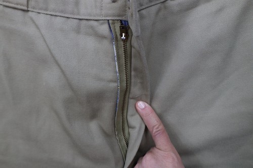Stains throughout. Cuffs, inner lining discolored. Inner lining pilled, has sticker. Color faded, Loose threads waist, button