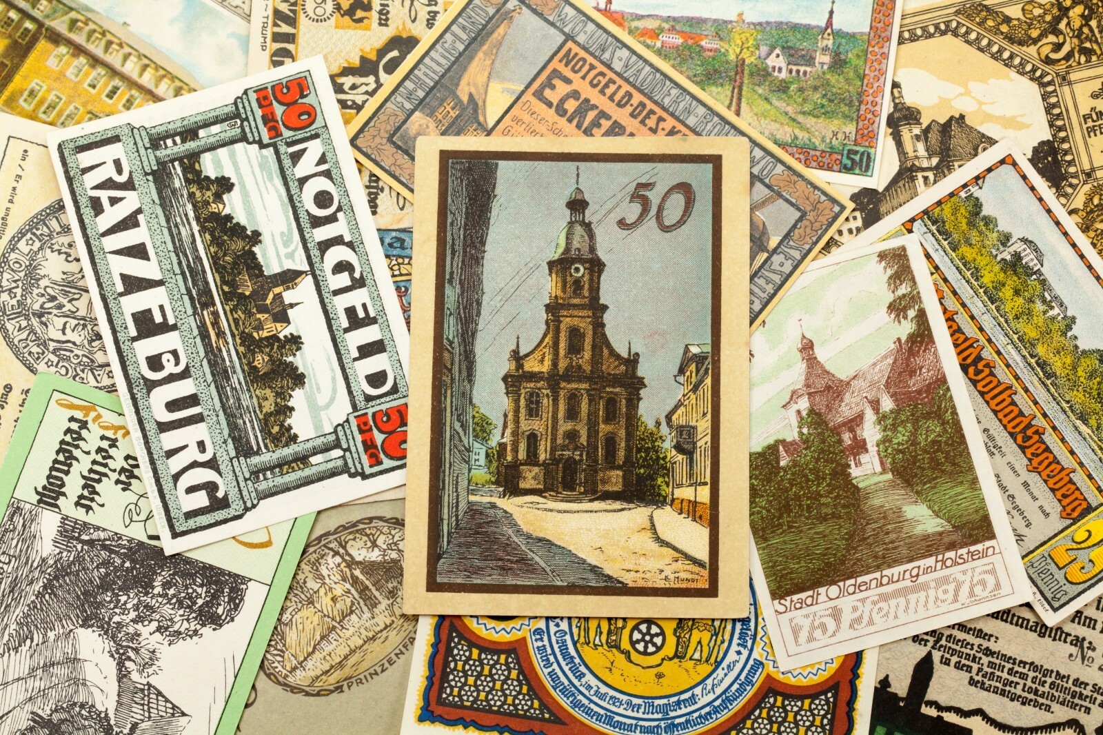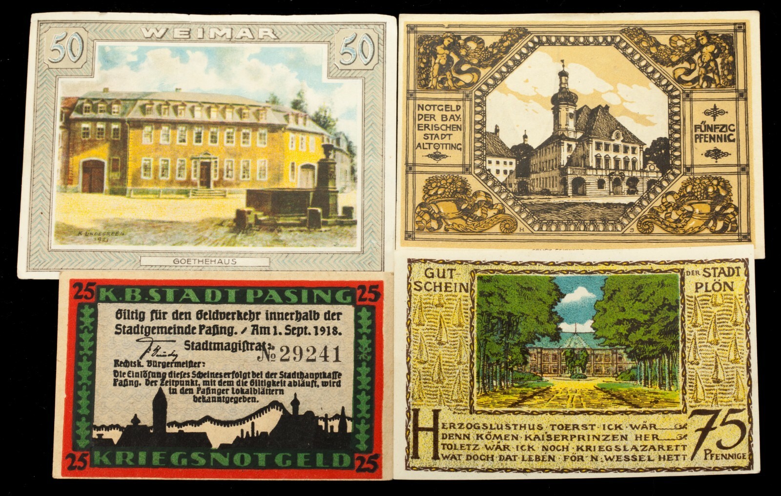 Ce lot comprendra 25 notes de notgeld individuelles d'Allemagne apres la Premiere Guerre mondiale. Valeurs faciales entre 5 pfennig a 5 marque. Theme des vues de la ville; Couvrages, batiments et paysages celebres.