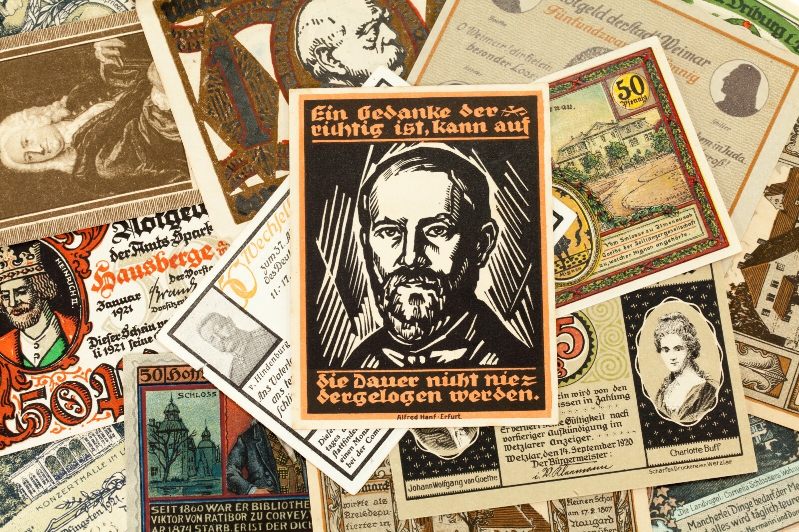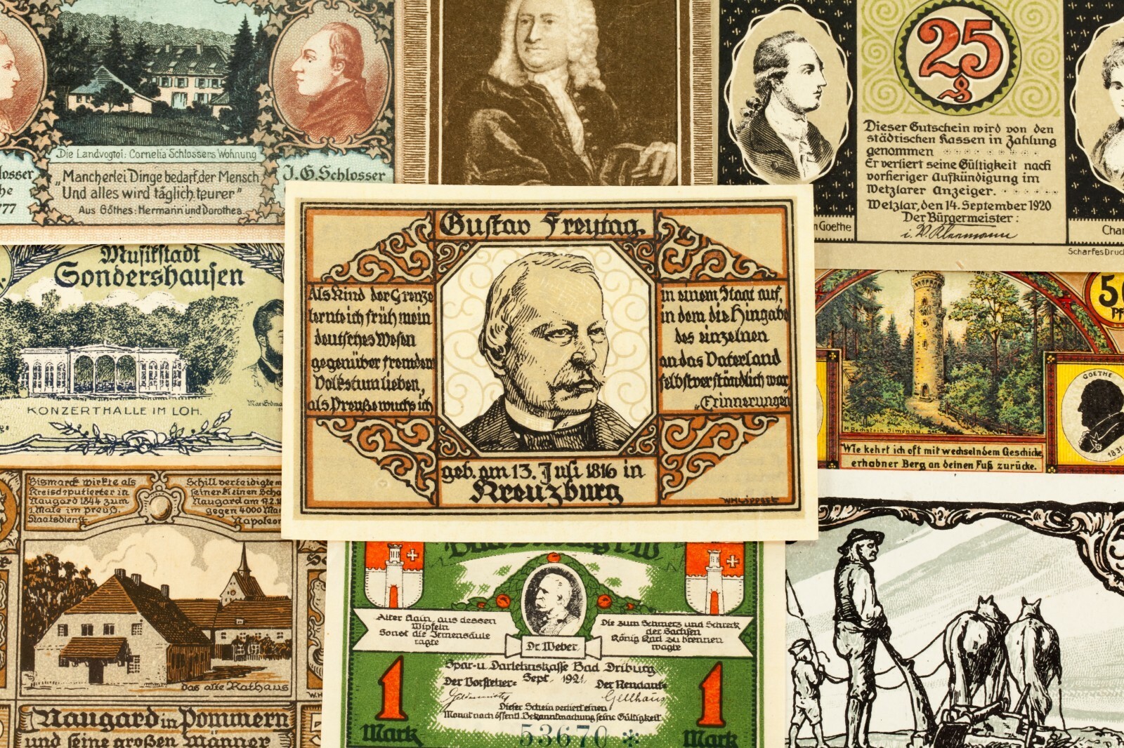 Ce lot comprendra 25 notes de notgeld individuelles d'Allemagne apres la Premiere Guerre mondiale. Valeurs faciales entre 5 pfennig a 5 marque. Theme des personnes celebres.