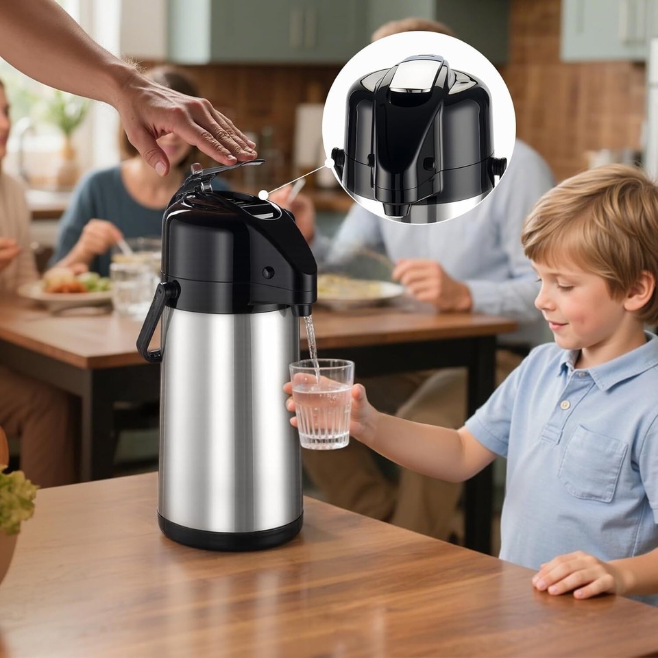 Durable, Professional Build: Designed to mimic the durability of restaurant-grade dispensers, this coffee airpot features a sturdy structure, including a reinforced lid and mechanism for long-lasting use. Its shorter height provides added stability, preventing tipping or wobbling, even in crowded spaces. A perfect choice for coffee lovers and those who host large gatherings with hot beverages.