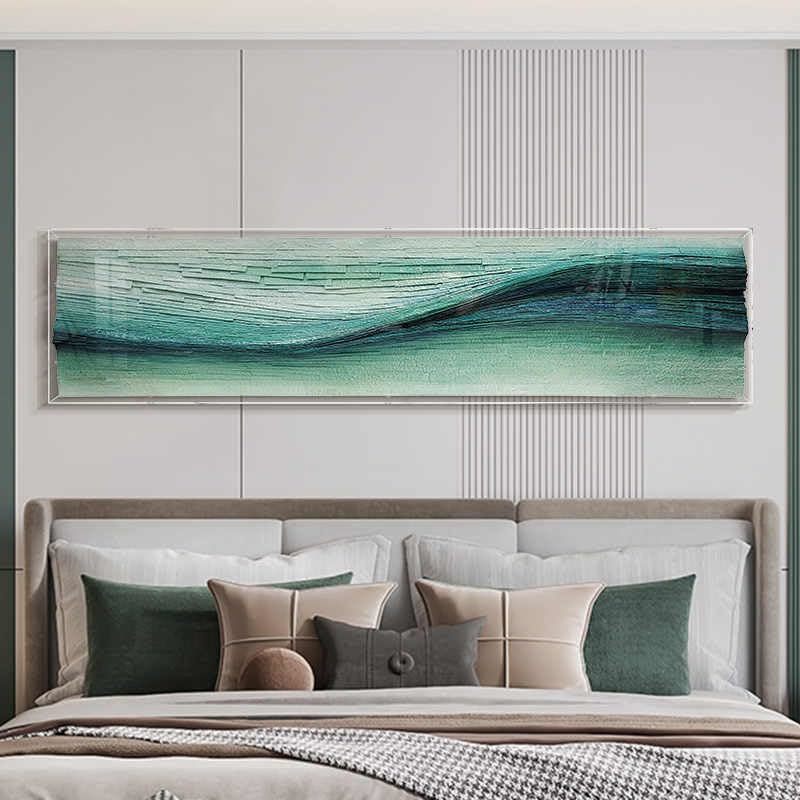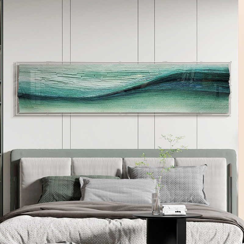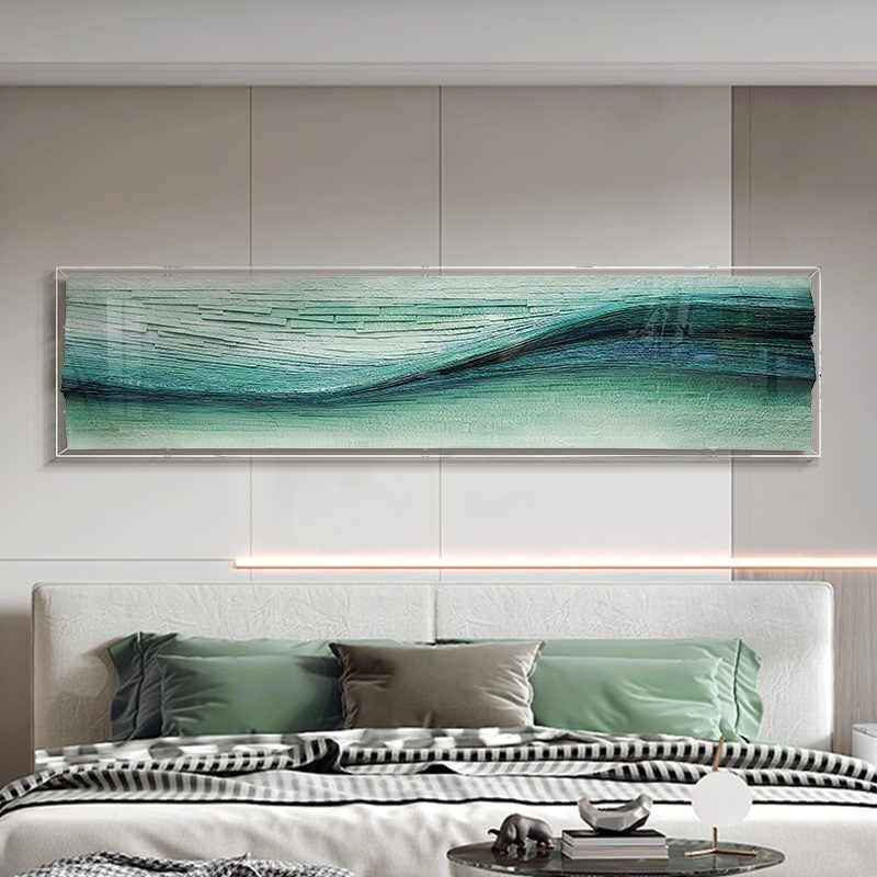 Product description: Elevate your interior design with this stunning High-End Luxury 3D Acrylic Wall Art by Interoknack. This sophisticated piece features a mesmerizing layered abstract wave design in tranquil green and teal tones, creating a visual masterpiece for contemporary spaces. Measuring 47 x 12 inches (120 x 30 cm), this handcrafted artwork offers genuine dimensional depth through its innovative construction of translucent and opaque acrylic layers, producing dynamic texture and organic movement that catches light beautifully. The generous size makes it perfect as a statement piece above bed headboards, sofa backdrops, or as a focal point on accent walls. Each panel is meticulously handmade, ensuring artisanal quality and uniqueness. The durable acrylic construction guarantees lasting brilliance while complementing minimalist, Scandinavian, or luxury interior styles. This versatile art installation works equally well in residential settings and upscale hospitality spaces seeking distinctive, high-value decorative elements that inspire and impress.