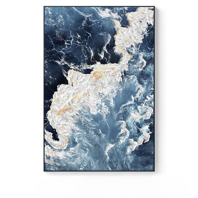 Product description: Transform your living space with this captivating modern minimalist deep blue abstract ocean wave canvas art. Measuring an impressive 43 x 71 inches, this vertical statement piece commands attention whether placed above your sofa, in your entryway, or along a hallway. Each canvas is meticulously hand-painted with textured oil paints that create a three-dimensional effect, bringing the dynamic movement of ocean waves into your home. The rich deep blue and white color palette is enhanced with subtle gold accents, adding sophistication and visual interest to any contemporary interior. The premium canvas is housed in a sleek black aluminum frame that completes its gallery-worthy appearance. Every piece features unique brushwork and texture variations, ensuring you own a truly one-of-a-kind artistic creation. This striking wall art serves as both a conversation starter and a room-defining focal point that elevates your interior design with its bold presence and artistic craftsmanship.