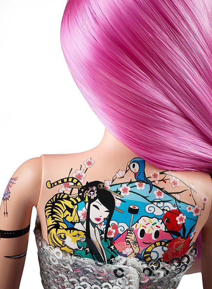 Once she?s caught your attention, you?ll be captivated by her intricate tattoos, and the skirt that features many of the cute and whimsical characters that have inhabited the world of tokidoki for 10 years!