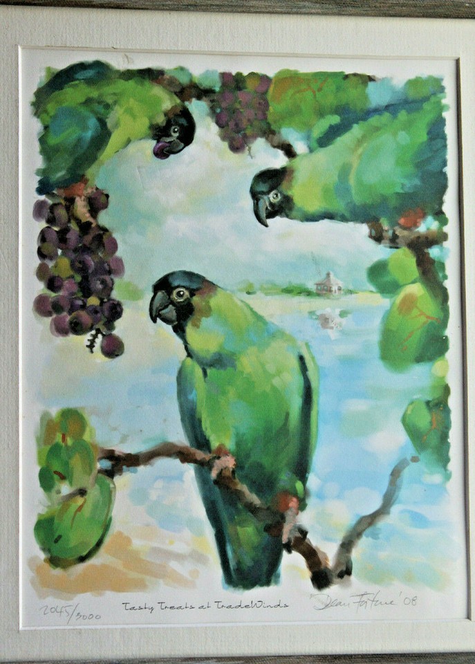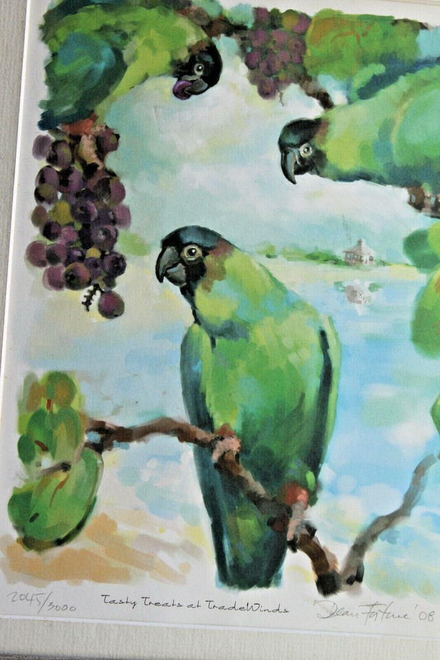 Green Parakeets Birds Watercolor signed by artist Dean Fature 08 "Tasty Treats at TradeWinds" Limited Edition 2045/3000 Signed