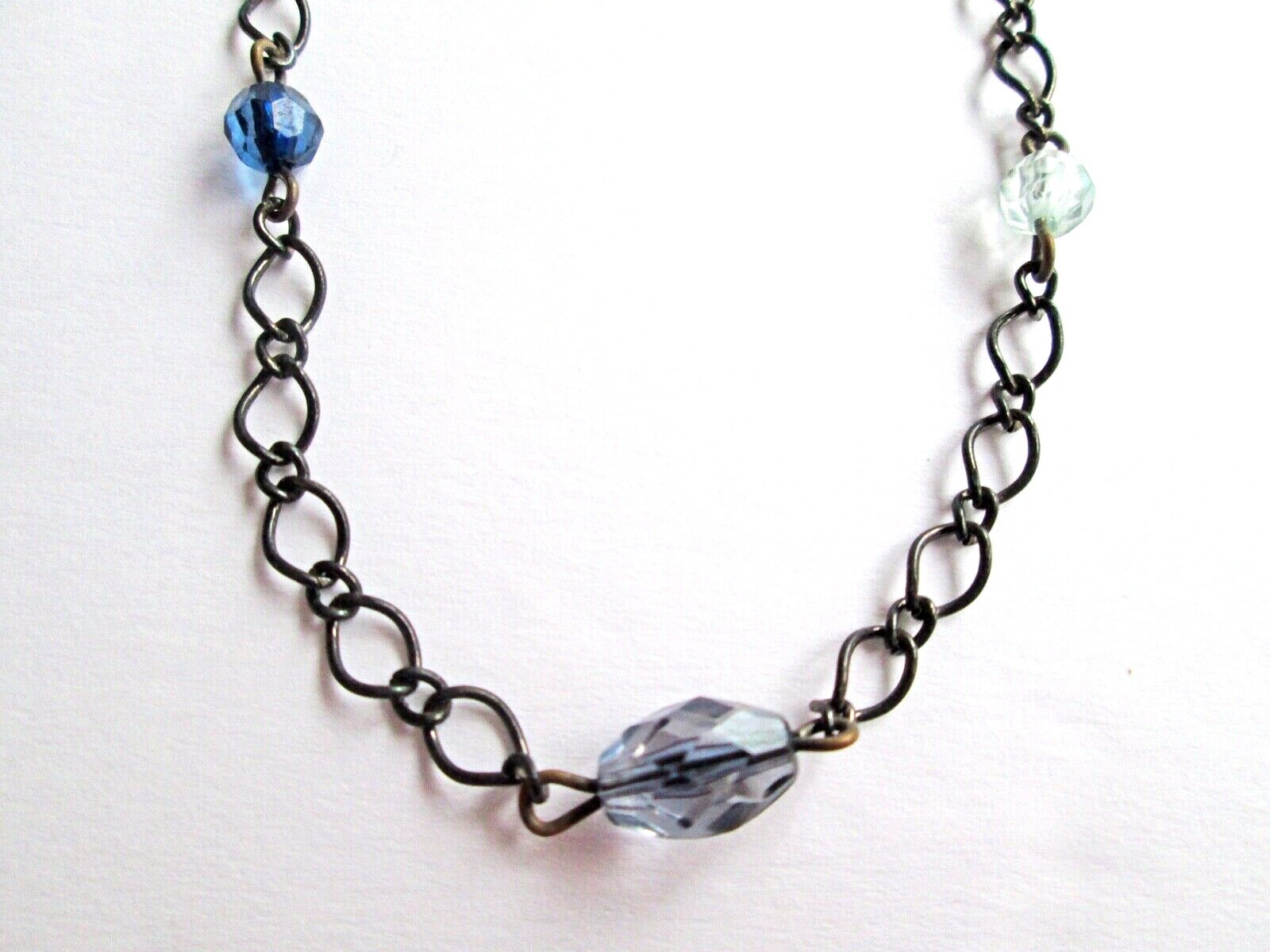 Filagree Necklace with Clear Light Blue Crystal Beads on Black Metal Chain