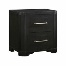 Elegant modern styling comprises the design of the Gilbert Collection while drawing subtle inspiration from the Art Deco movement. The oak veneer of the collection features a charcoal finish providing a rich hue to the distinct wood grain. Polished brass-tone bar pulls center each drawer of the nightstand for complementing contrast.